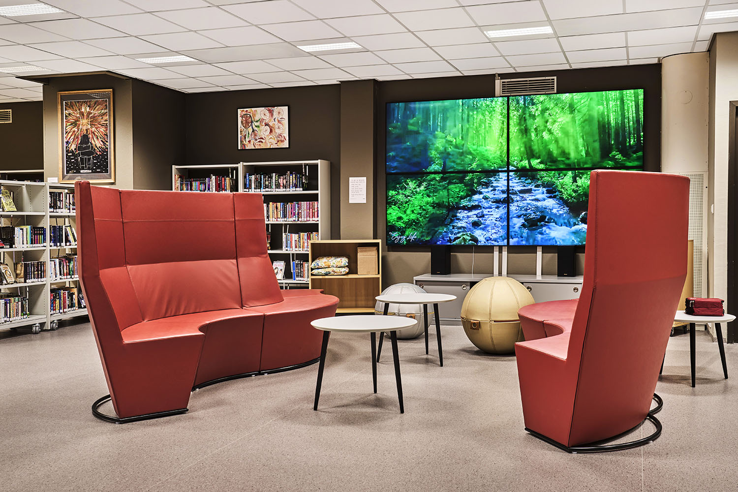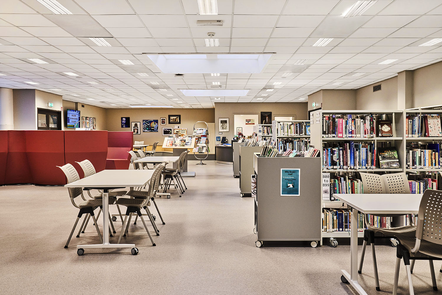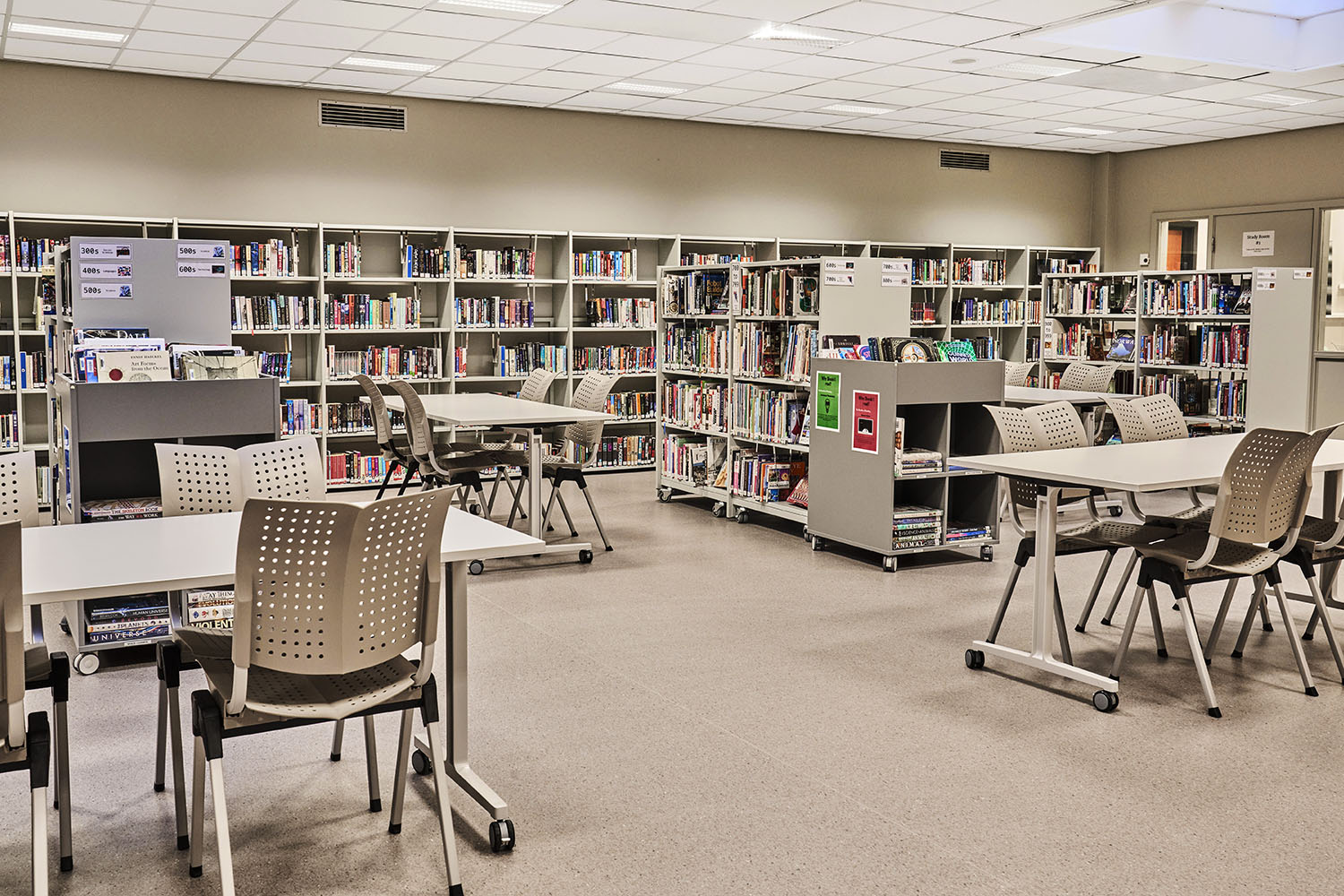 Die Bibliothek ist geräumig und mit vielen Ressourcen versehen, die Möglichkeiten für viele verschiedene Aktivitäten bieten. Einige der Bibliotheksmöbel sind auf Rollen montiert, so dass sie flexibel und leicht zu bewegen sind, z. B. wenn die Bodenfläche für Veranstaltungen genutzt werden soll.