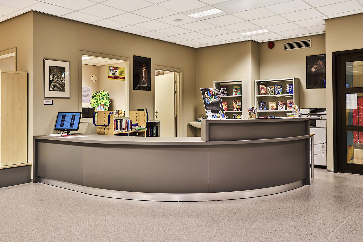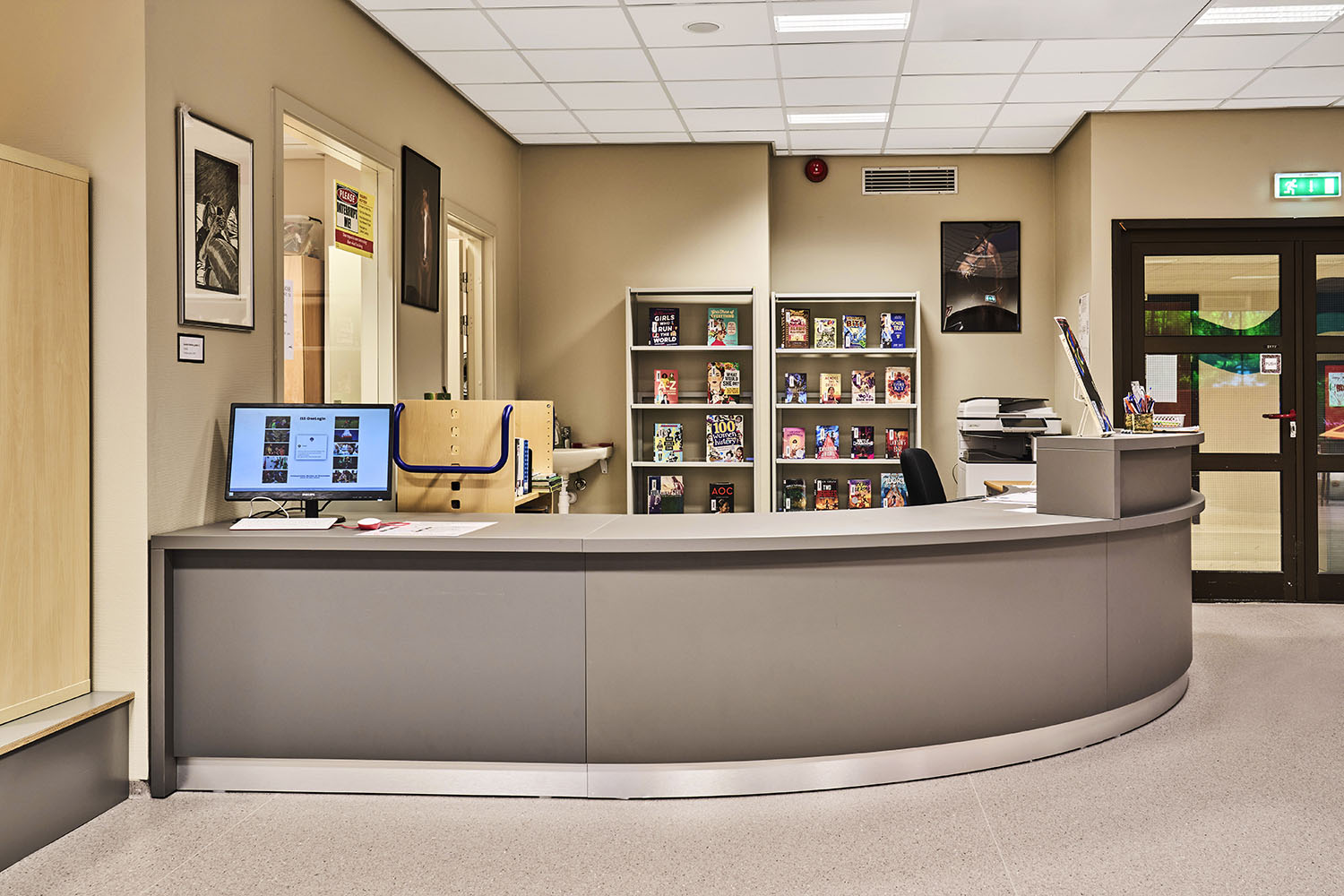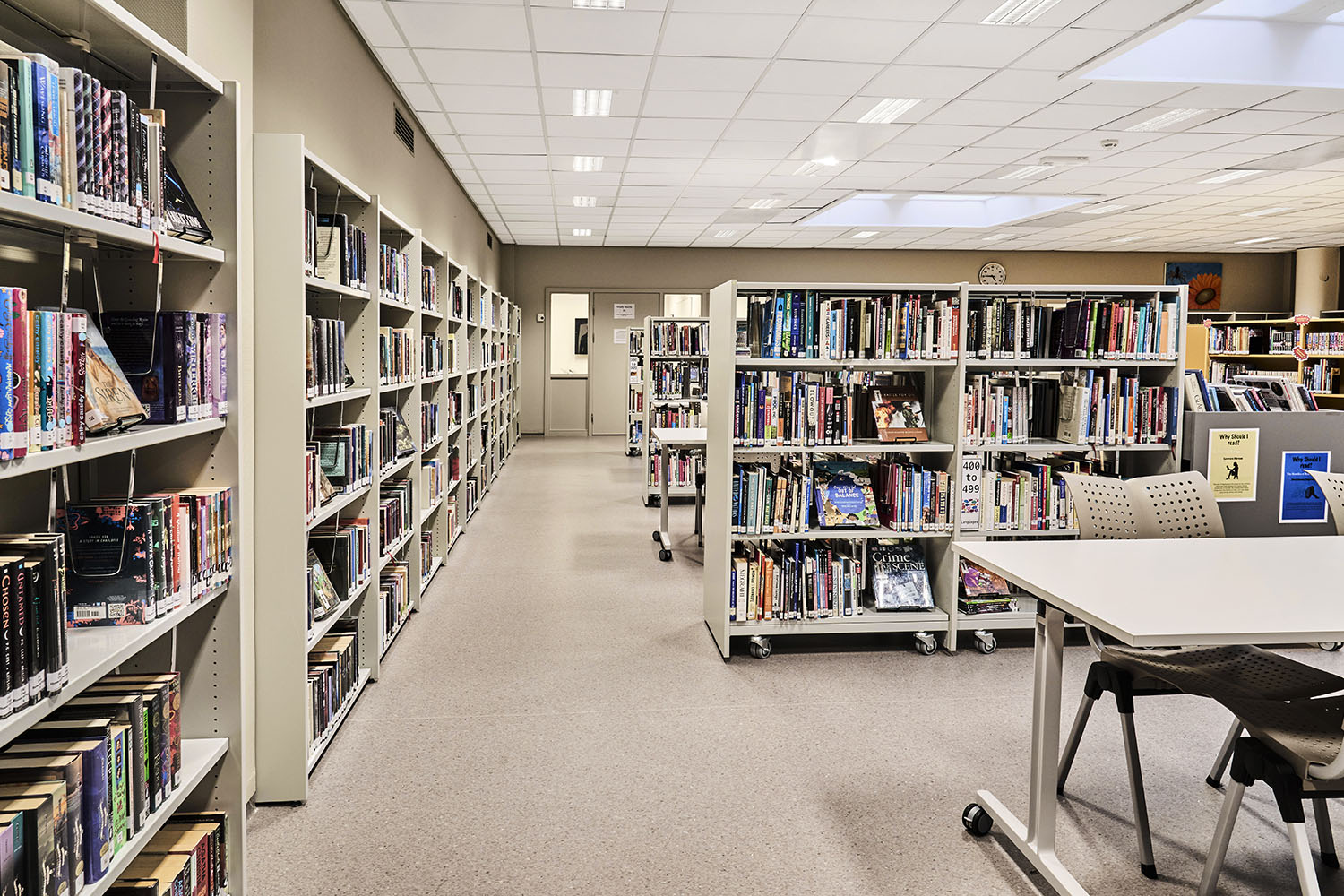 Die Bibliothek ist geräumig und mit vielen Ressourcen versehen, die Möglichkeiten für viele verschiedene Aktivitäten bieten. Einige der Bibliotheksmöbel sind auf Rollen montiert, so dass sie flexibel und leicht zu bewegen sind, z. B. wenn die Bodenfläche für Veranstaltungen genutzt werden soll.