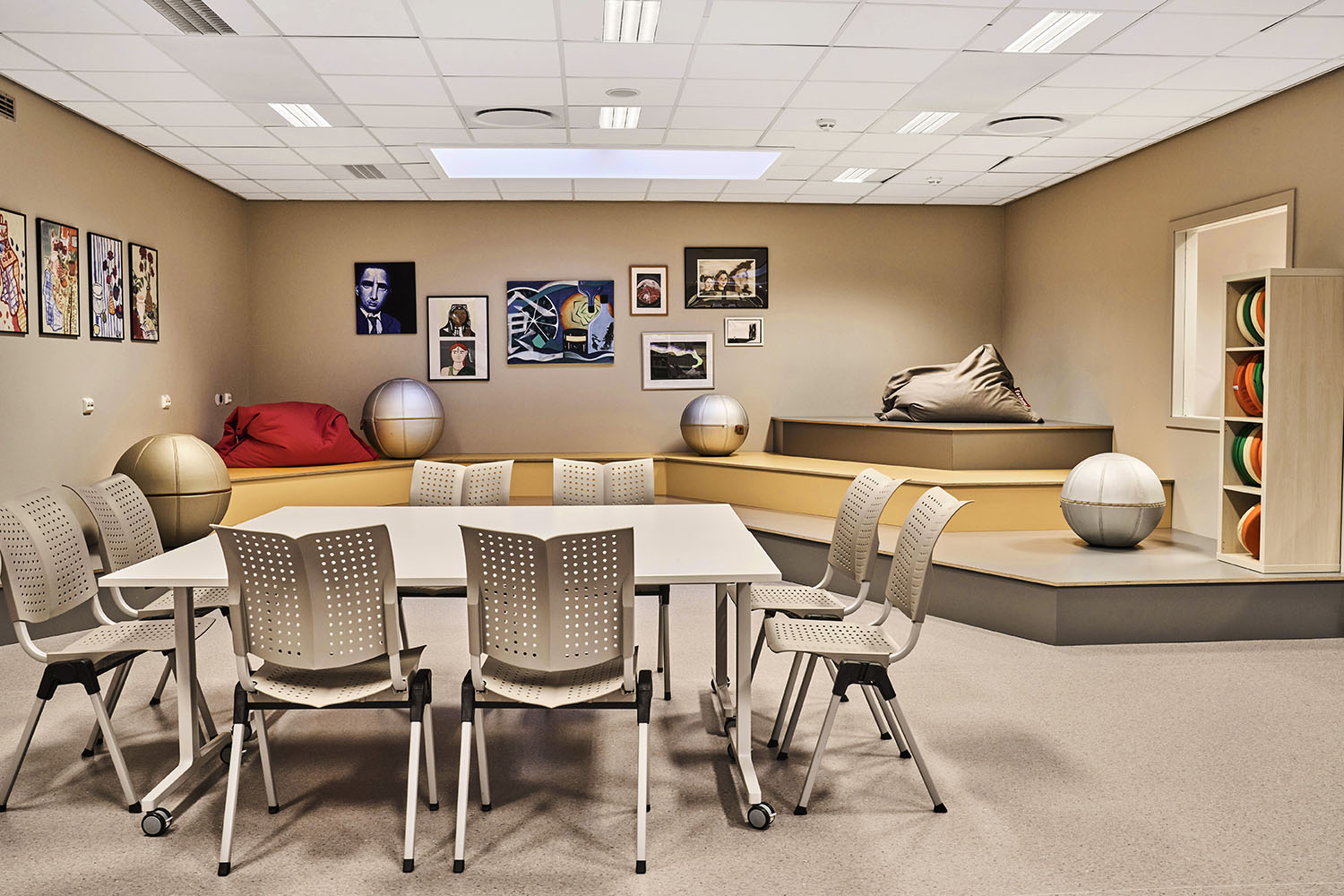 Organische Sitzbereiche und eine maßgeschneiderte Treppe bieten Raum für Gemeinschaft und soziale Kontakte zwischen den Klassenstufen. Poufs, Sitzkissen, Sitzsäcke und flexible Stühle geben den Schülern die Möglichkeit, ihre Sitzposition je nach Aktivität und Bequemlichkeit zu variieren.