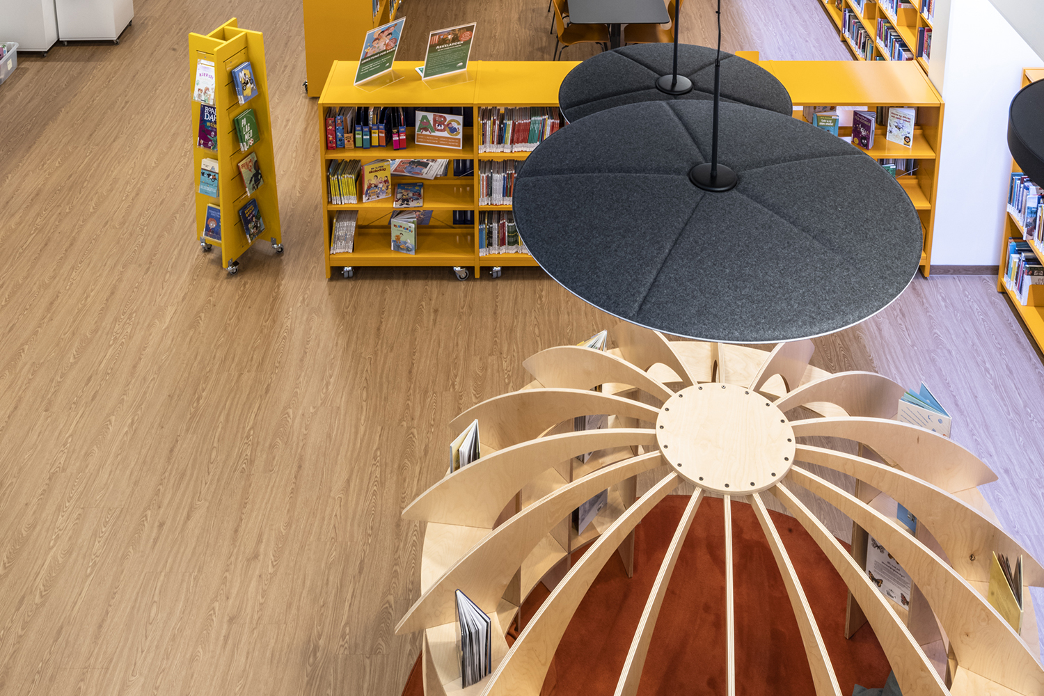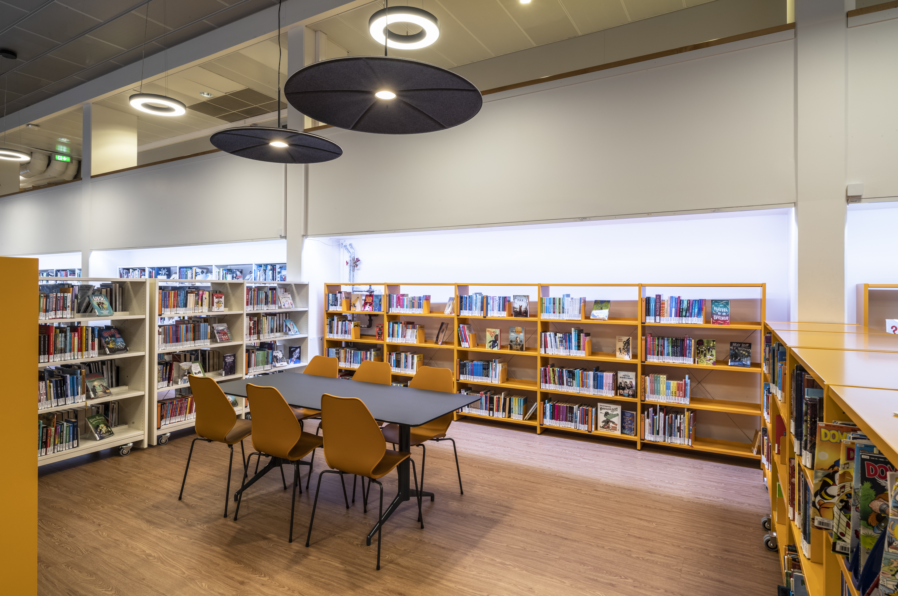 Flexibilität, Licht und Geräumigkeit sind Schlüsselwörter für das neue Layout. Die Doppelregale auf dem Boden sind mit Rollen ausgestattet, sodass der Raum vielfältig genutzt werden kann, beispielsweise für Veranstaltungen. Die Höhe der Regalsysteme beträgt 152 cm, was zu einer offeneren Bibliothek beiträgt, die einen besseren Überblick und mehr Licht bietet.