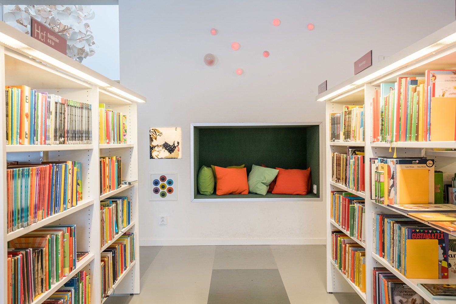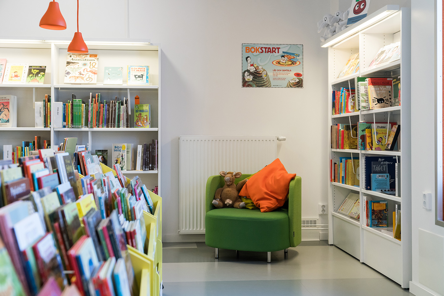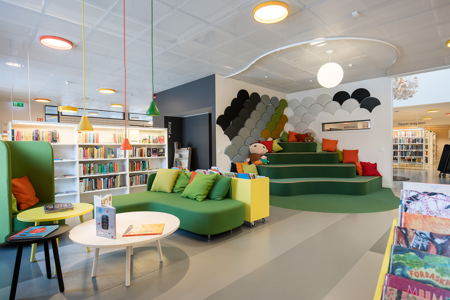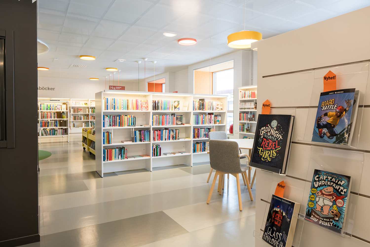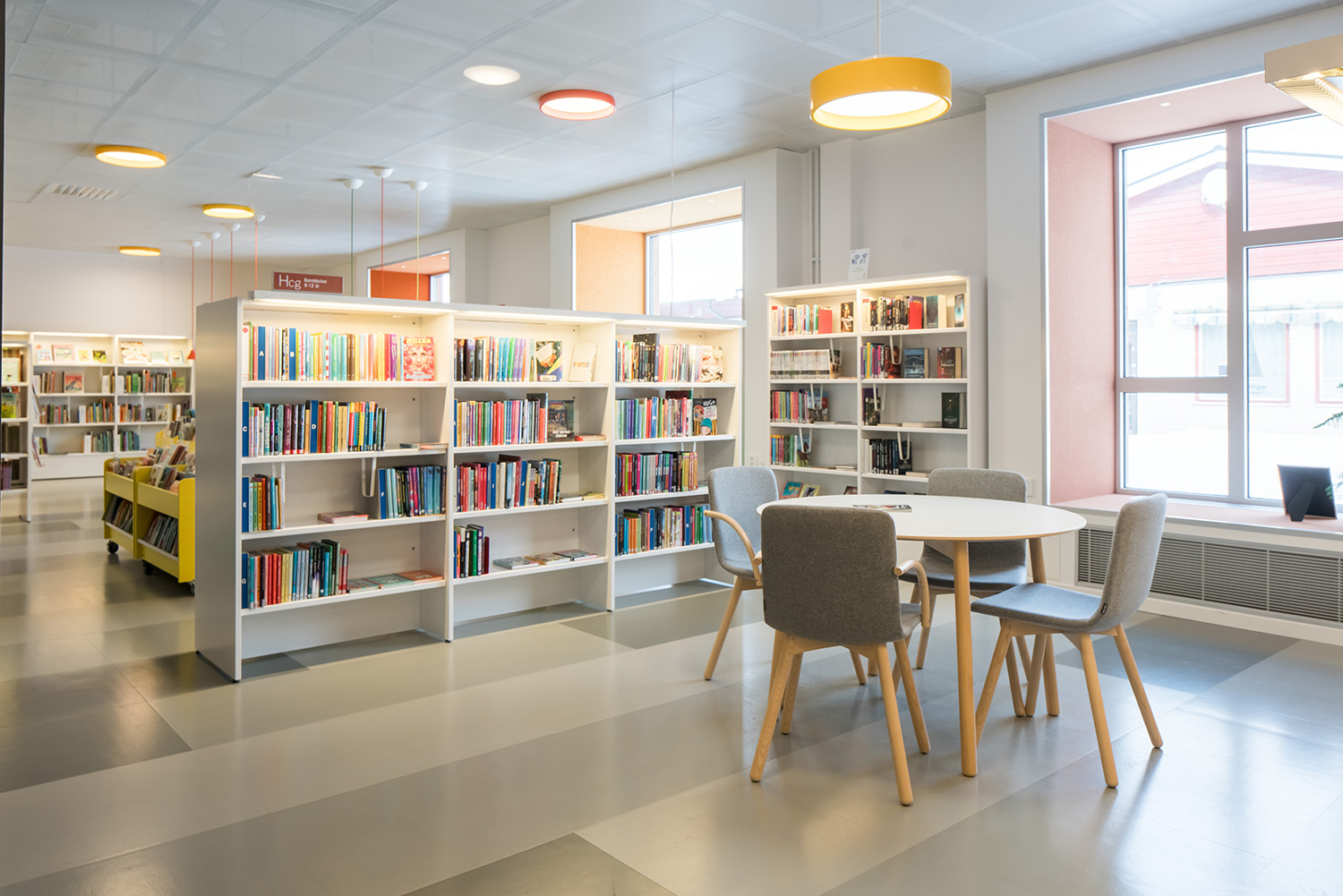 Die Bibliothek ist in einem Gebäude untergebracht, das mit seinen großen Fenstern den Vorzug natürlichen Lichteinfalles bietet. Das Ergebnis ist eine helle und einladende Umgebung. Sämtliche Altersgruppen sind berücksichtigt. Es gibt eine attraktive Kinderabteilung und verschiedene Lese- und Arbeitszonen mit leichtem Zugang zu den Bibliotheksmaterialien auf Regalfachböden mit integrierter Beleuchtung.