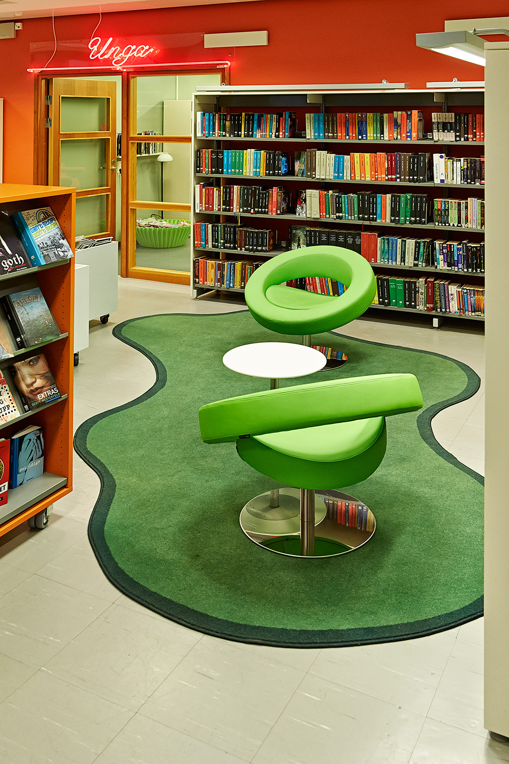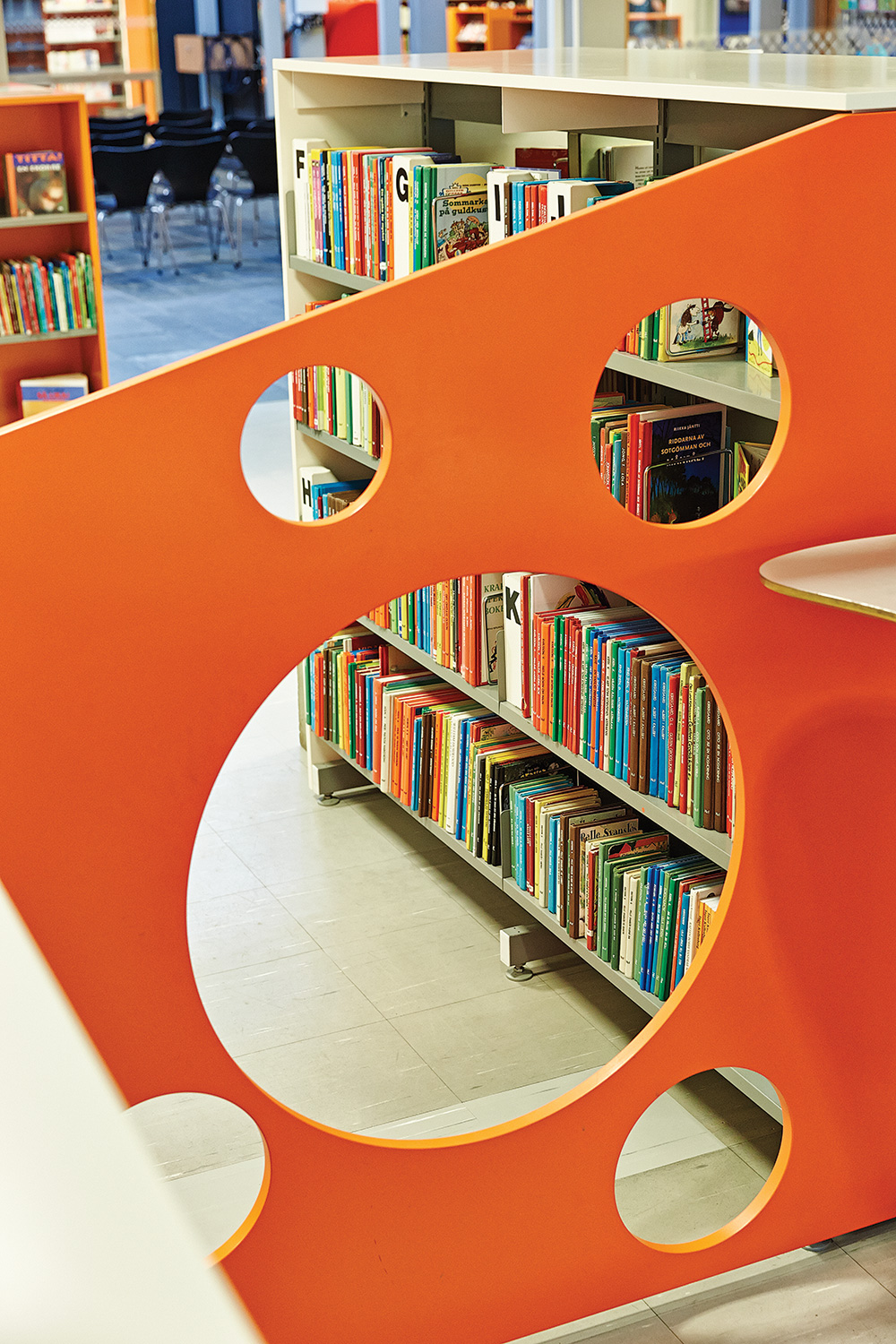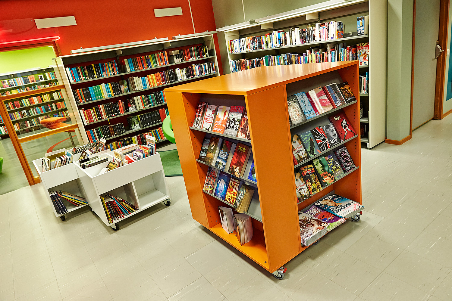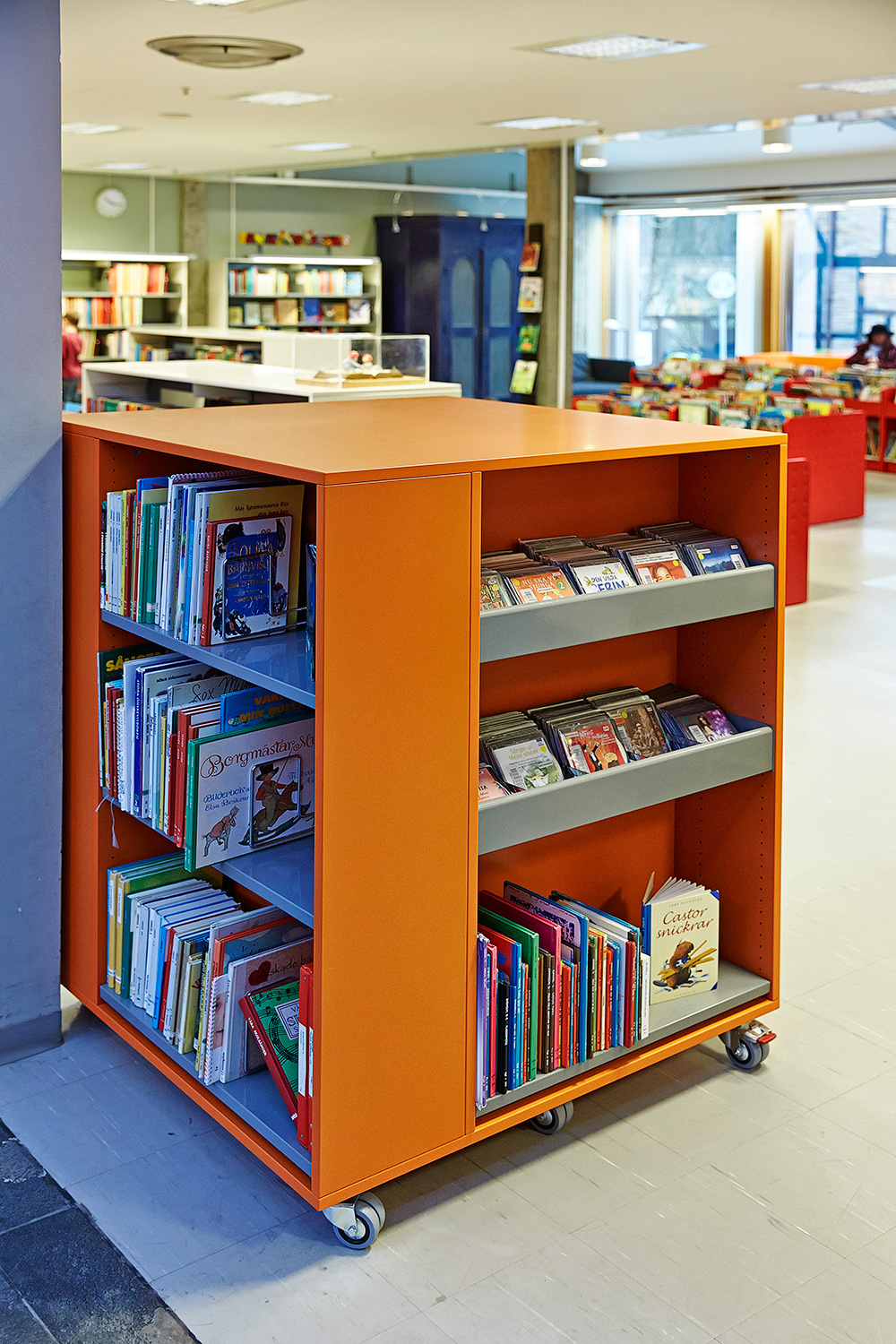 Die Hauptbibliothek in Lund befindet sich seit den 1970er Jahren im selben Gebäude. Im Laufe der Jahre wurde es immer wieder schrittweise renoviert und modernisiert. Zuletzt war die Kinderabteilung an der Reihe und unser eigener Innenarchitekt hat einen farbenfrohen Entwurf gemacht. Die beiden Bereiche – für kleinere Kinder und für Jugendliche – wurden mit Farben, Teppichböden und farbenfrohen Wänden zwischen den Regalen gestaltet.