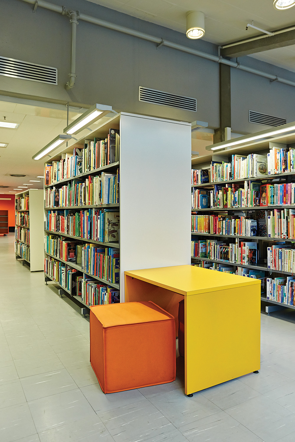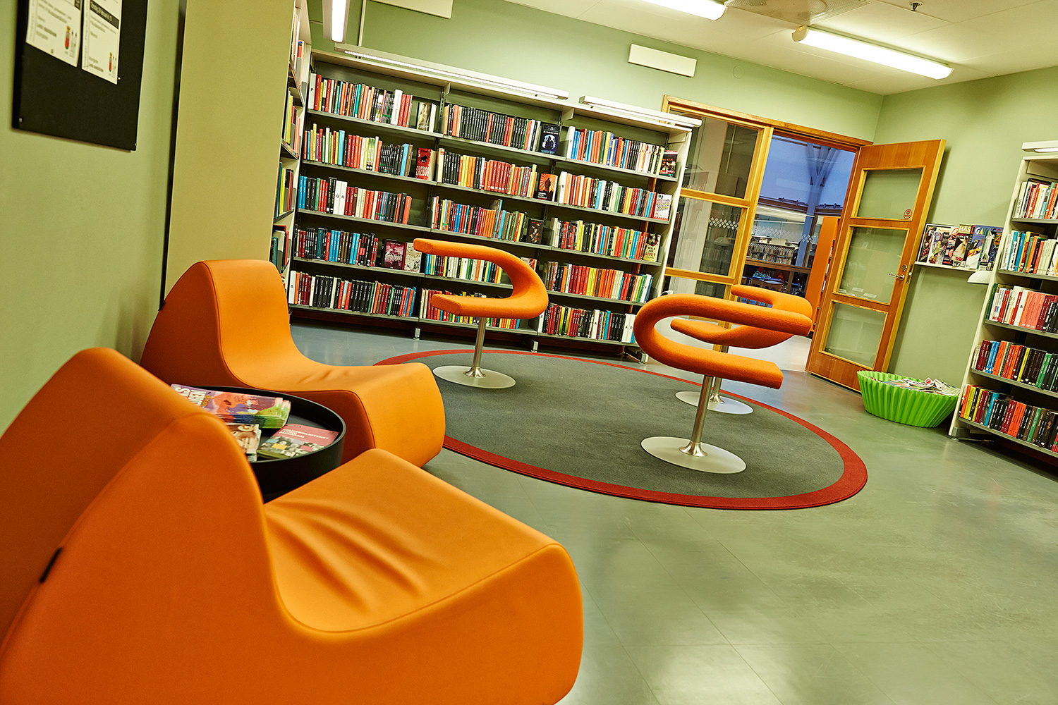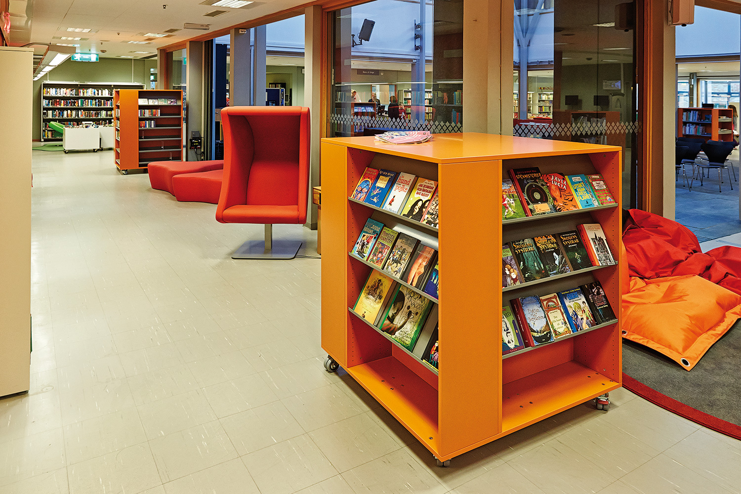 Die Hauptbibliothek in Lund befindet sich seit den 1970er Jahren im selben Gebäude. Im Laufe der Jahre wurde es immer wieder schrittweise renoviert und modernisiert. Zuletzt war die Kinderabteilung an der Reihe und unser eigener Innenarchitekt hat einen farbenfrohen Entwurf gemacht. Die beiden Bereiche – für kleinere Kinder und für Jugendliche – wurden mit Farben, Teppichböden und farbenfrohen Wänden zwischen den Regalen gestaltet.