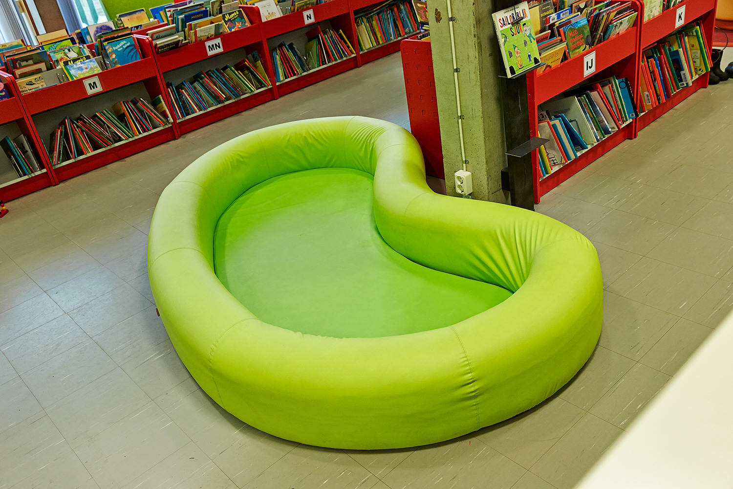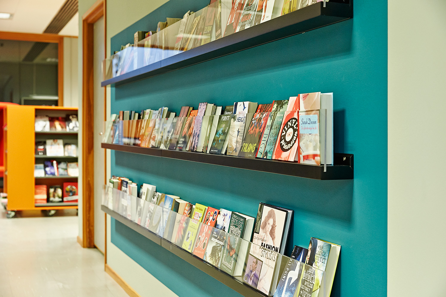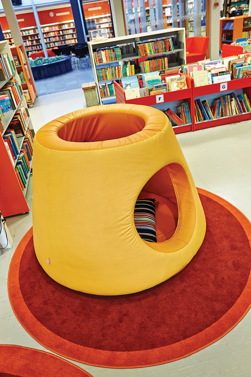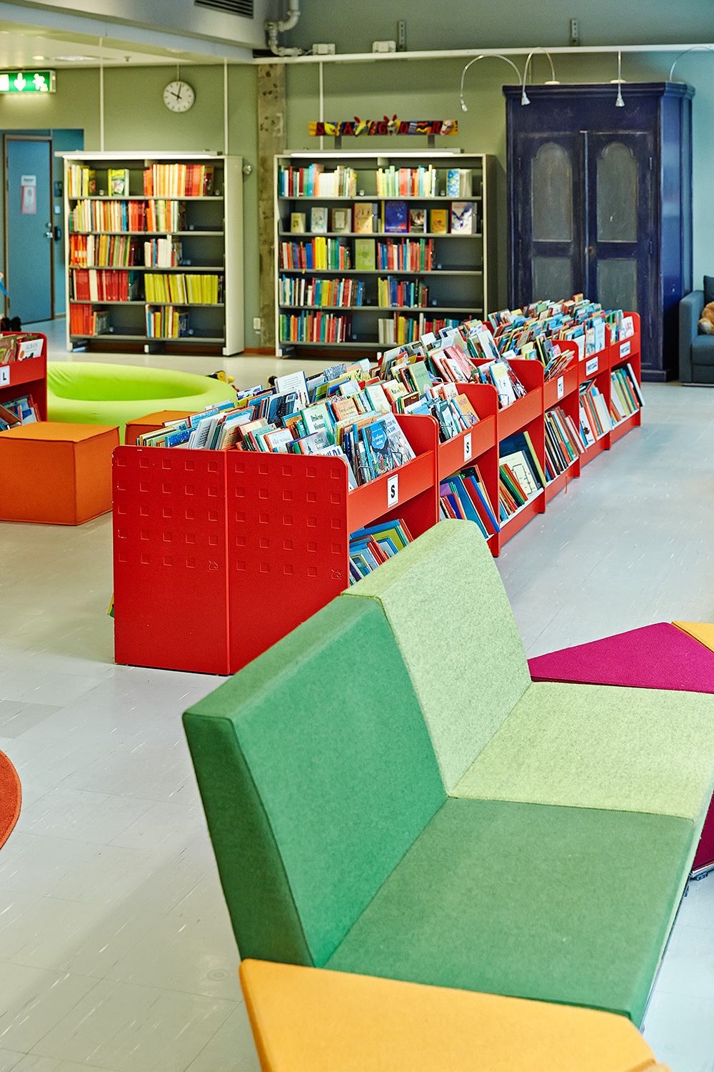 Die Hauptbibliothek in Lund befindet sich seit den 1970er Jahren im selben Gebäude. Im Laufe der Jahre wurde es immer wieder schrittweise renoviert und modernisiert. Zuletzt war die Kinderabteilung an der Reihe und unser eigener Innenarchitekt hat einen farbenfrohen Entwurf gemacht. Die beiden Bereiche – für kleinere Kinder und für Jugendliche – wurden mit Farben, Teppichböden und farbenfrohen Wänden zwischen den Regalen gestaltet.