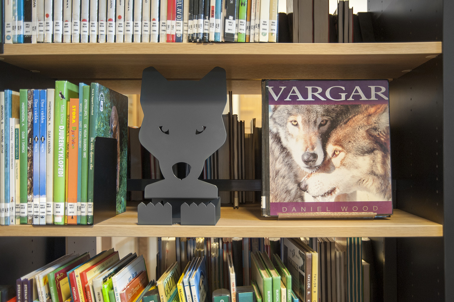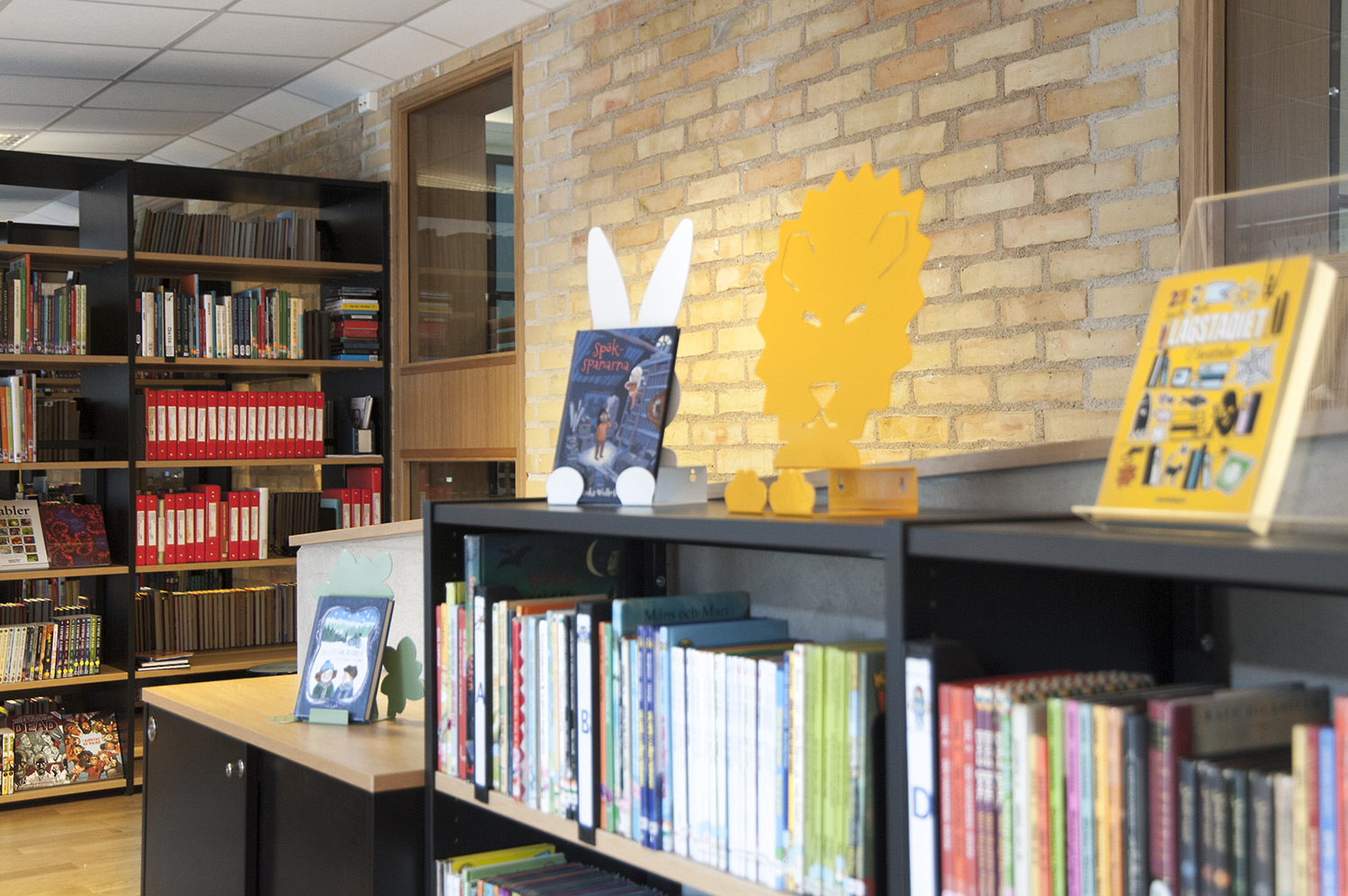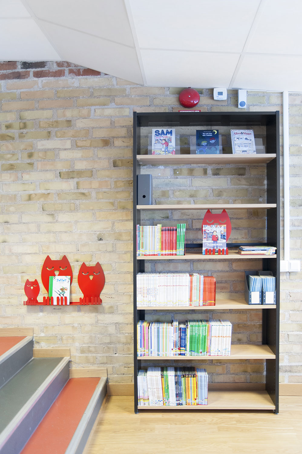 Die Bibliothek legt besonderes Gewicht auf die Präsentation der Bücher und sonstigen Materialien sowie deren leichte Zugänglichkeit, indem sie die Buchrücken mit Symbol-Schildern markiert. Präsentationsständer in augenfälligen Formen wie Eule, Kaninchen, Wolf und Löwe werden als Anziehungspunkte für die Bücher und anderen Medien in inspirierender und vergnüglicher Weise eingesetzt. Nahe bei dem „Easy-to-read“-Regal sitzt an der Wand die Eulenfamilie und zeigt spannende Buchtitel.