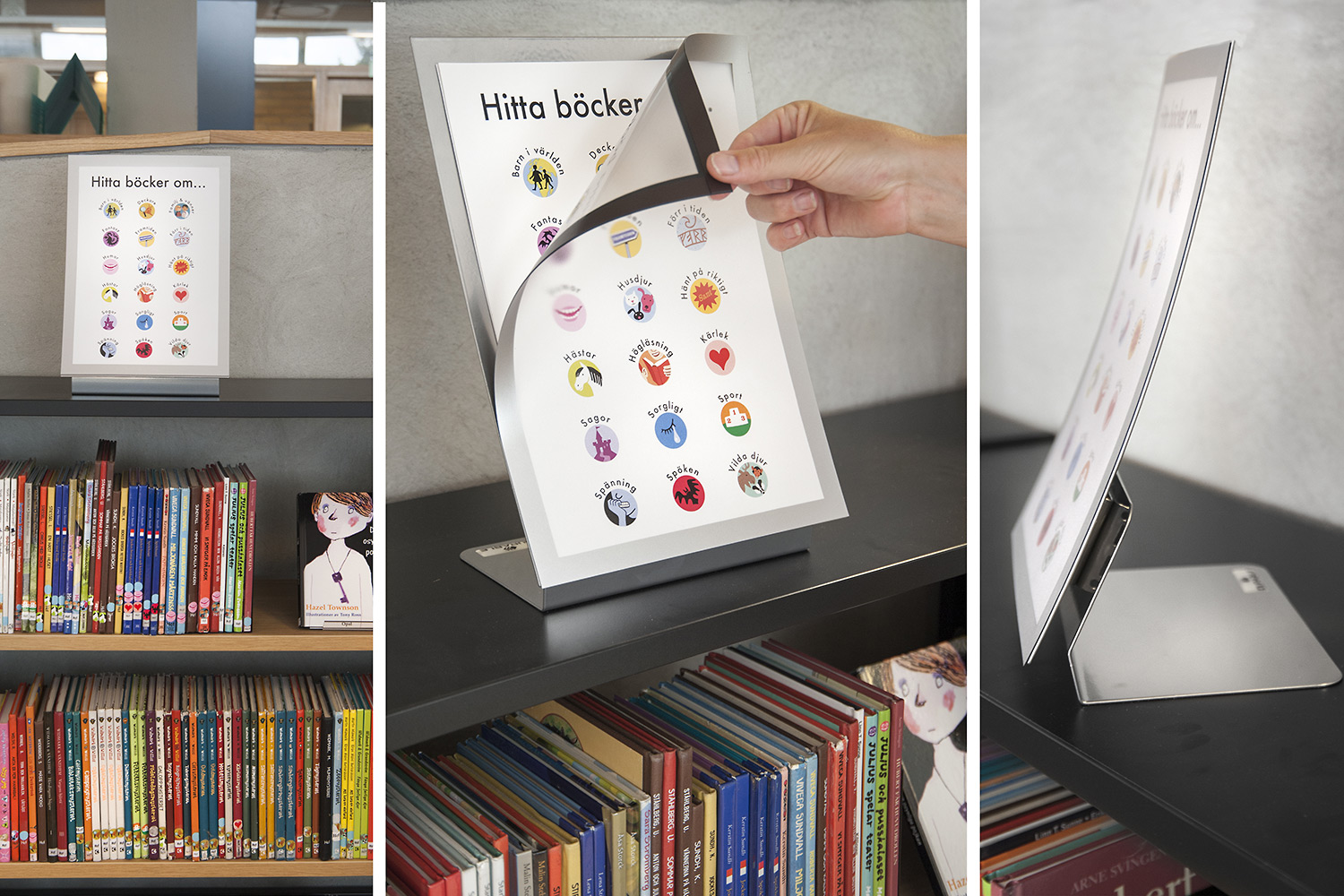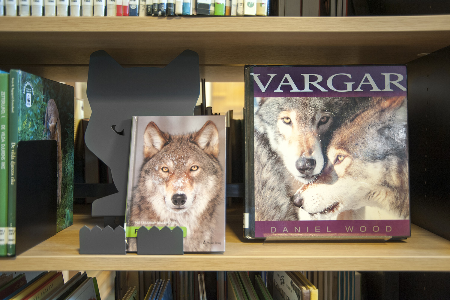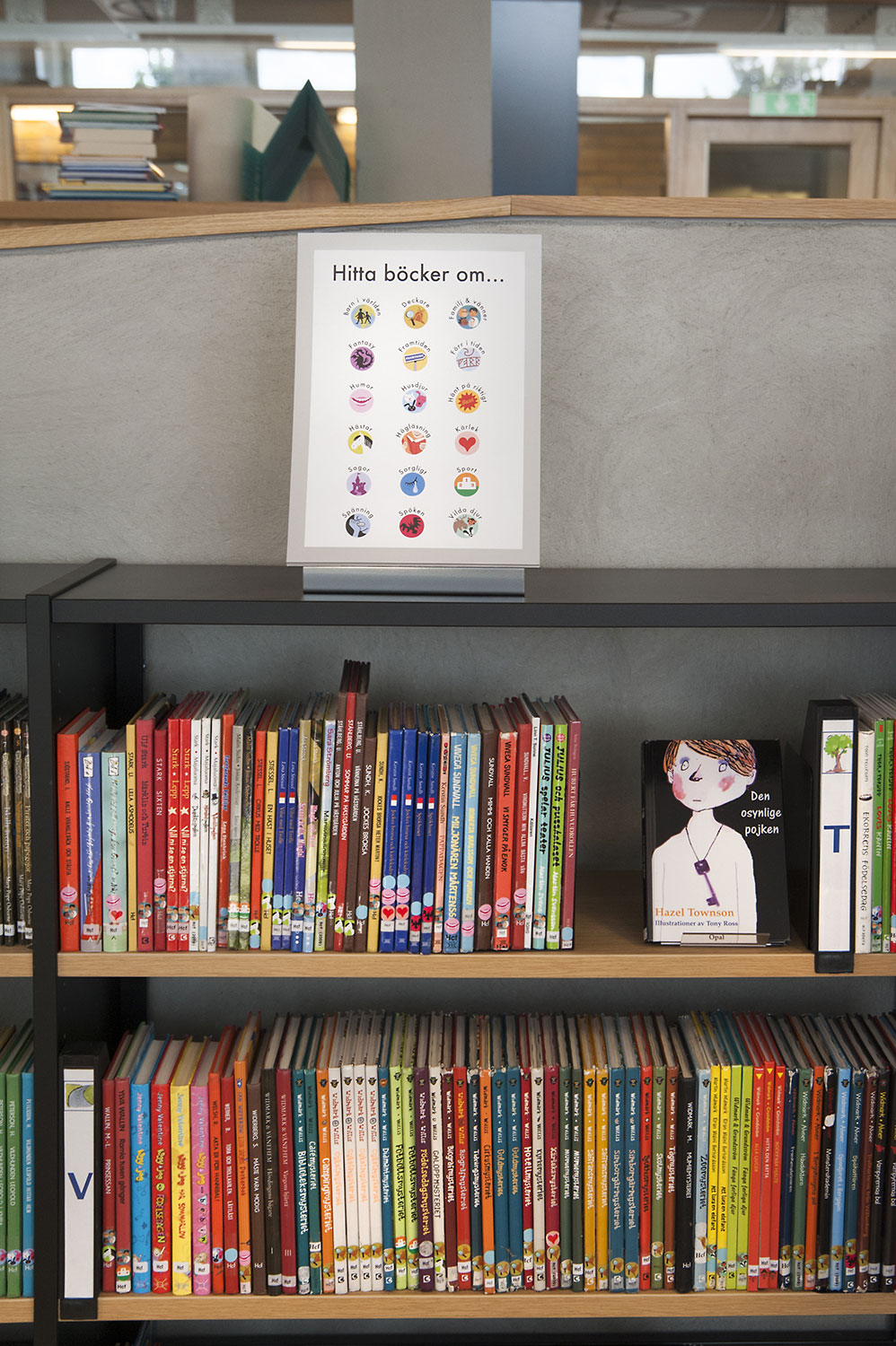 Die Bibliothek legt besonderes Gewicht auf die Präsentation der Bücher und sonstigen Materialien sowie deren leichte Zugänglichkeit, indem sie die Buchrücken mit Symbol-Schildern markiert. Präsentationsständer in augenfälligen Formen wie Eule, Kaninchen, Wolf und Löwe werden als Anziehungspunkte für die Bücher und anderen Medien in inspirierender und vergnüglicher Weise eingesetzt. Nahe bei dem „Easy-to-read“-Regal sitzt an der Wand die Eulenfamilie und zeigt spannende Buchtitel.