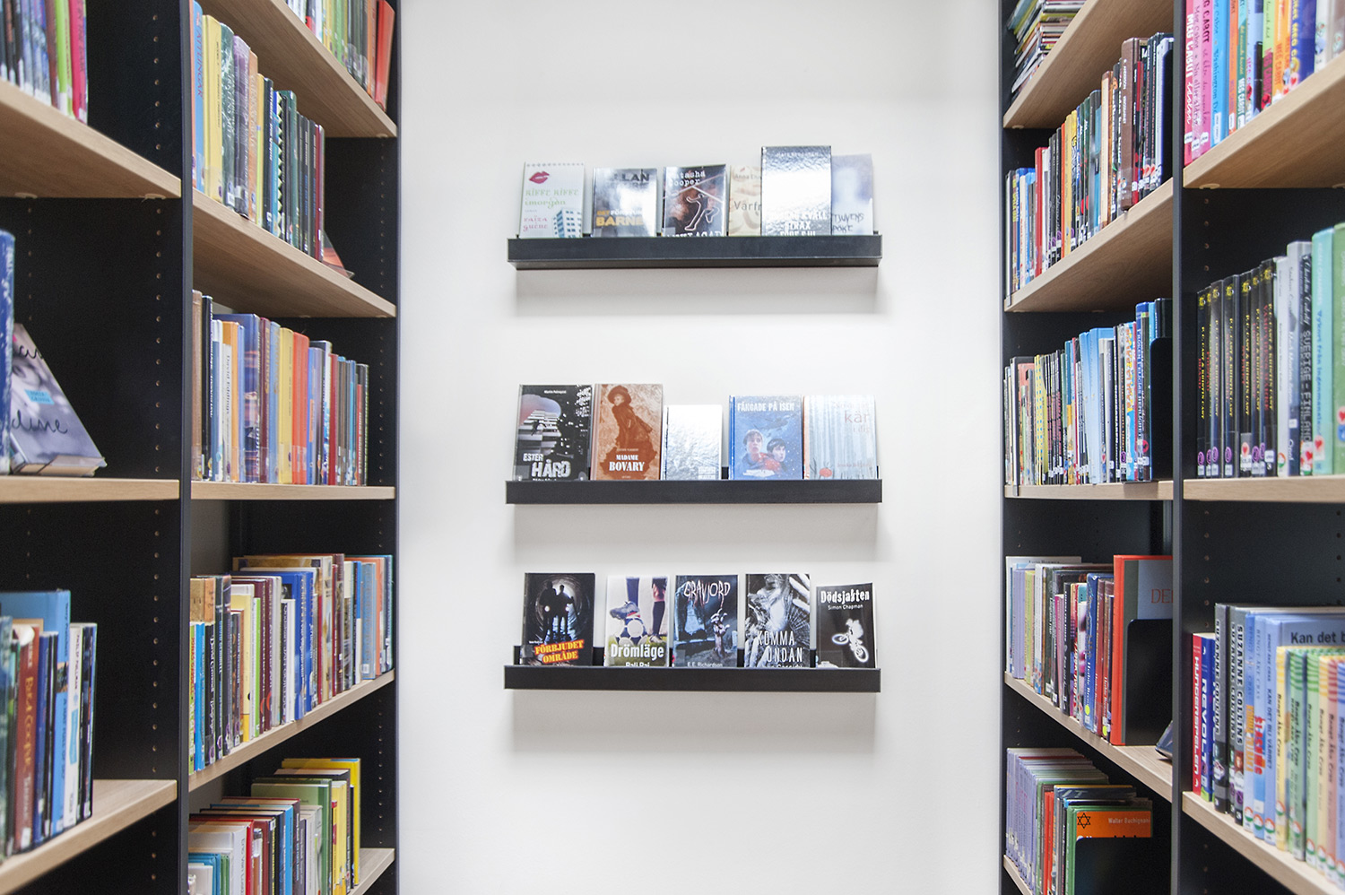 Unser Regalsystem Frontline mit schwarz lackierten Seitenverkleidungen und Fachböden in Eiche-Furnier findet sich in der ganzen Bibliothek, ergänzt durch eine Theke in gleicher Farbe und Bücherwagen aus der Plus-Serie.