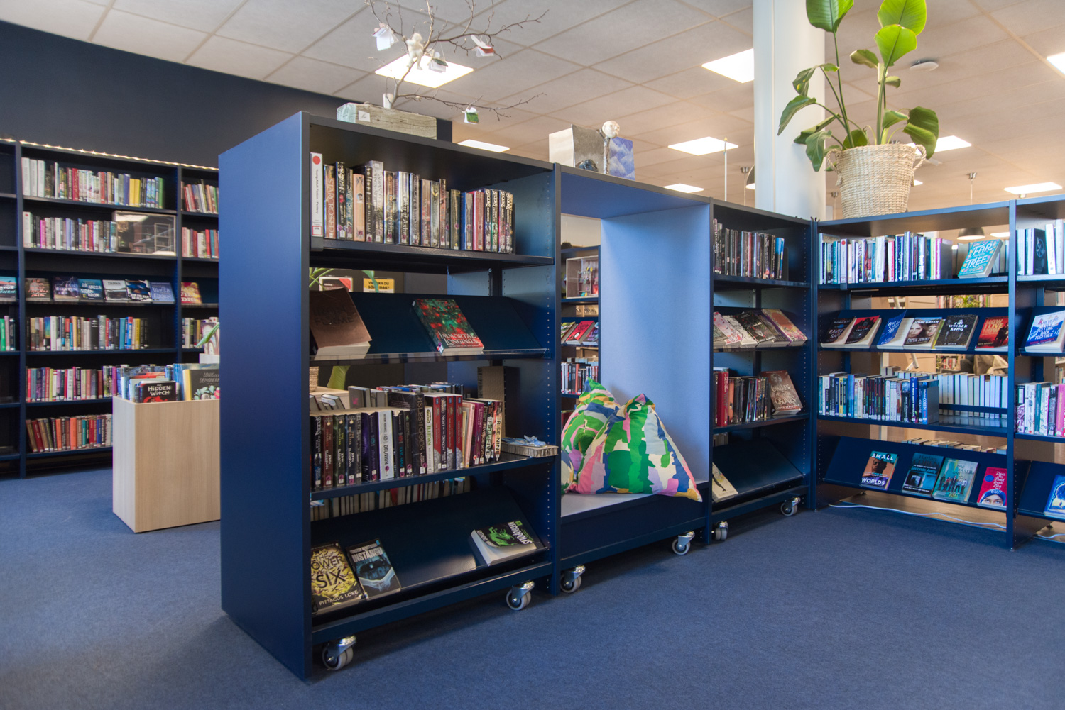 Die Abteilung hat ihre eigene Farbe an den Regalen und Wänden erhalten, um zu unterstreichen, dass es sich um eine eigene Abteilung handelt. Wir wollten auch eine andere Art von Umgebung bieten als beispielsweise ein Vergnügungspark. Wir wollten eine Alternative für diejenigen sein, die einen ruhigen Ort suchen. Deshalb haben wir uns für Drehstühle mit hohen Rückenlehnen entschieden, um das Allein- statt das Zusammensitzen zu fördern. In eines der Regale ist eine Lesehöhle integriert, die ebenfalls einen gemütlichen Eindruck vermittelt und zum Lesen anregen soll.“