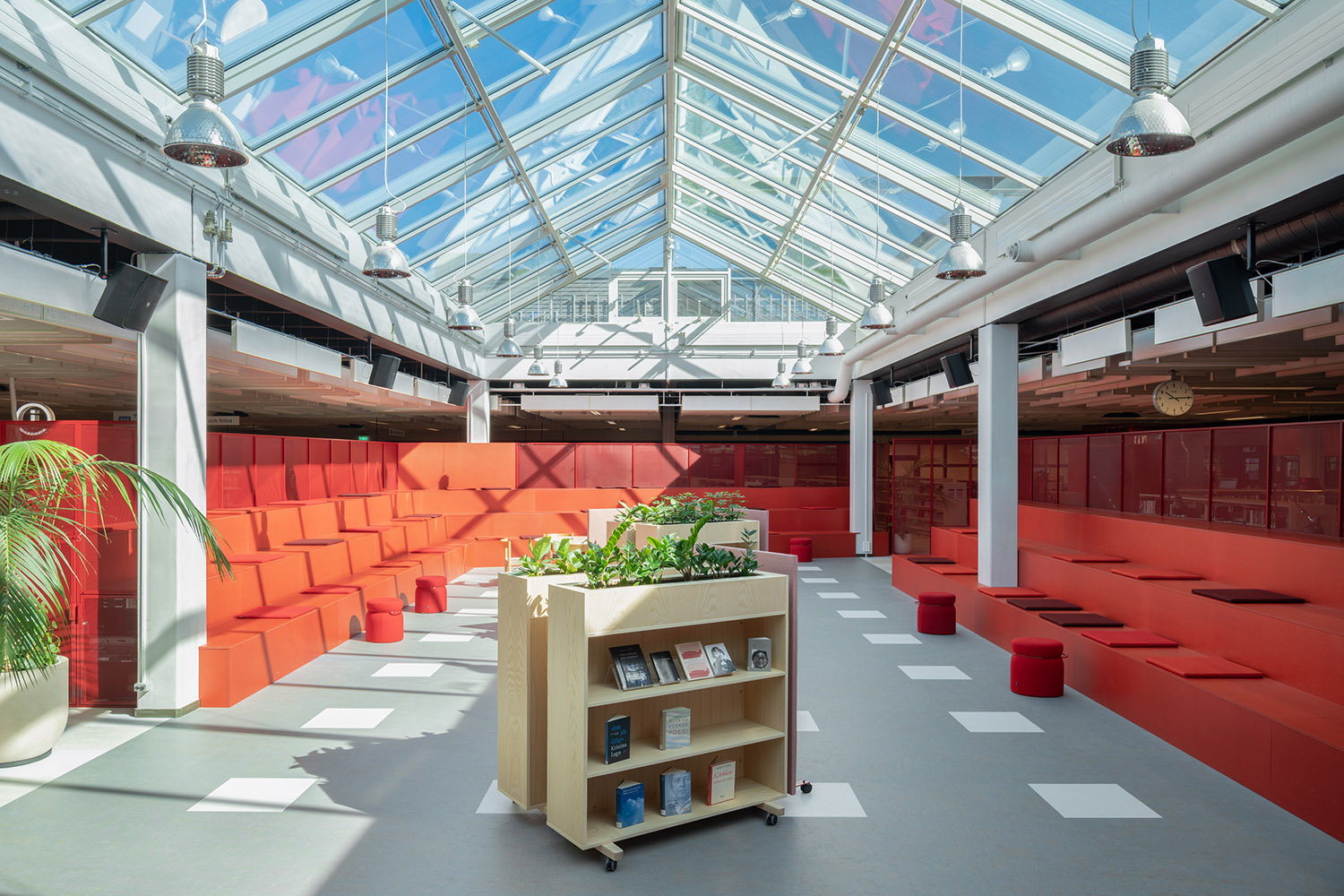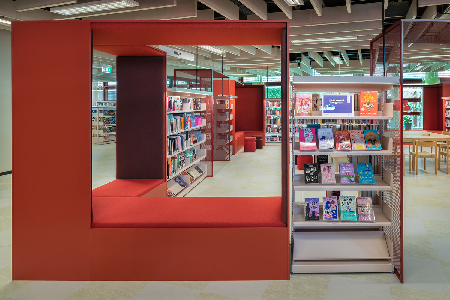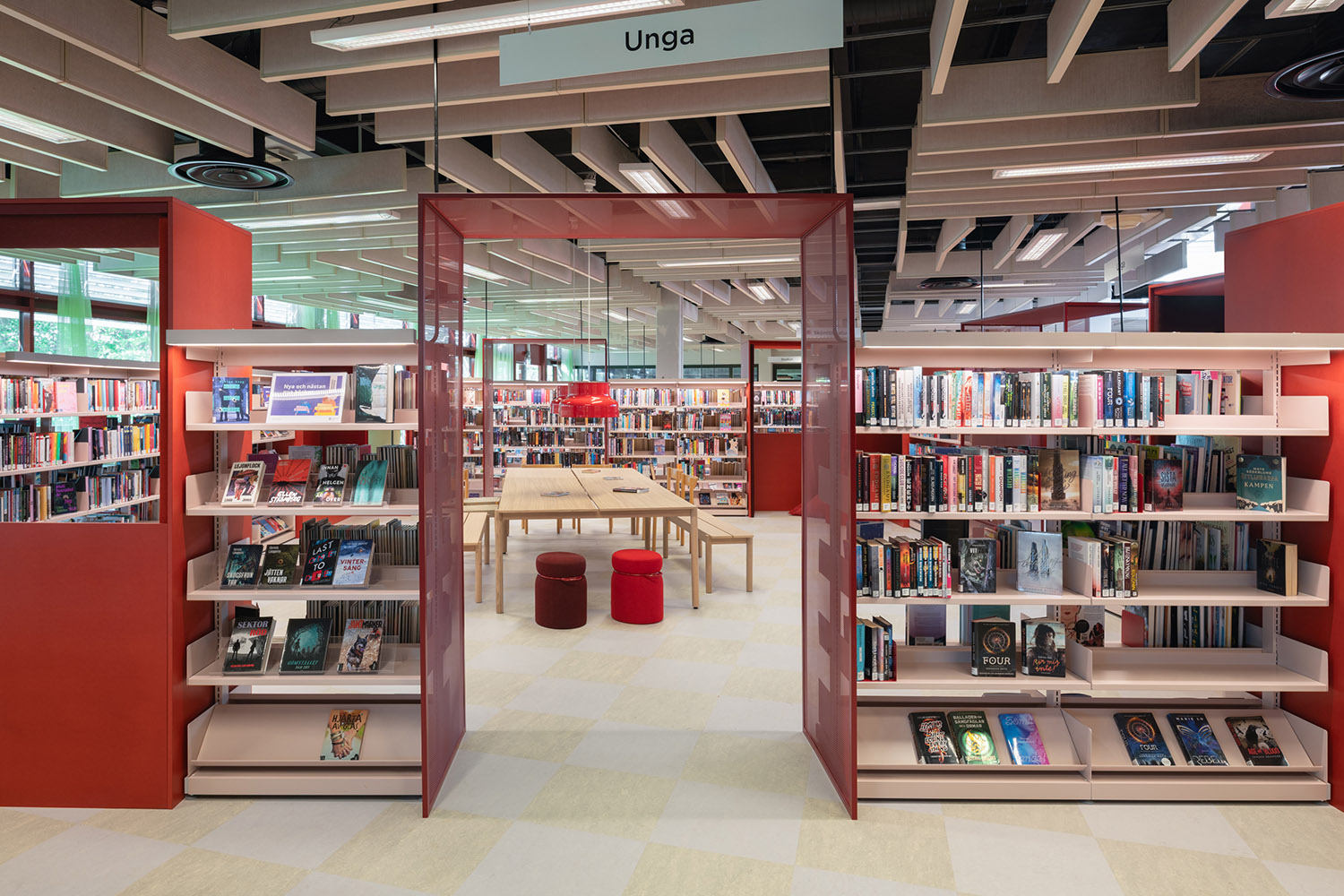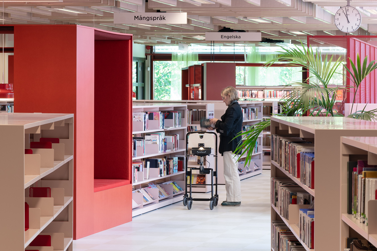 Die Bibliothek in Västra Frölunda ist ein zentraler Bestandteil des Frölunda Kulturzentrums. Ihre flexiblen, modularen Regale bieten Platz für verschiedene Medien wie Bücher, Zeitschriften und Multimedia. Die Bibliothek ist als integrativer Lernort konzipiert, in dem Besucher in unterschiedlichen Bereichen – darunter ruhigen Arbeitsplätzen, Gruppenräumen und Kinderzonen – entdecken und lernen können.