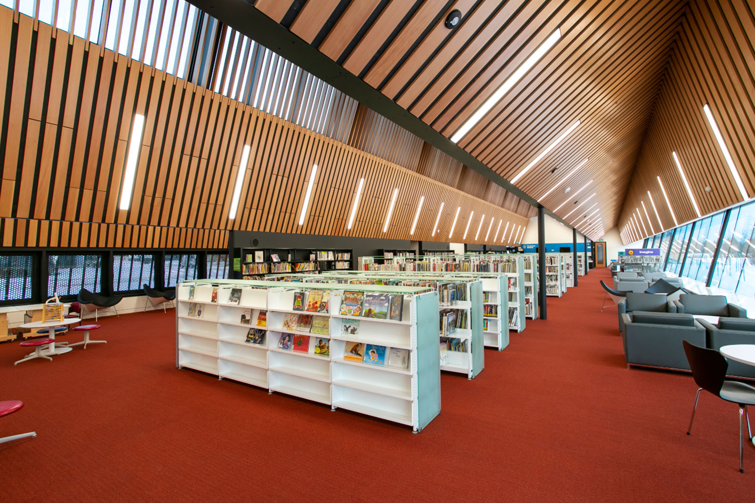 Die Capilano-Filiale der Edmonton Public Library wurde in einem brandneuen Gebäude und einer neuen Lage mit ruhiger Aussicht und viel Tageslicht eröffnet. Der Ort ist sowohl zugänglich als auch mit der Natur verbunden. Die Bibliothek verfügt über Zugang zum Erdgeschoss, der dazu beitragen wird, Barrierefreiheitsprobleme in der alten Einrichtung im zweiten Stock der Capilano Mall zu lösen.