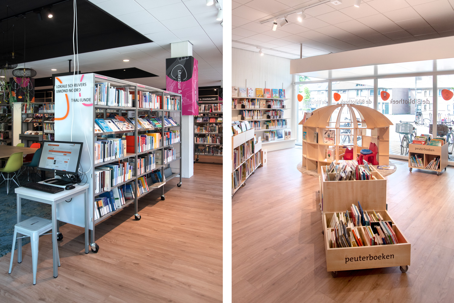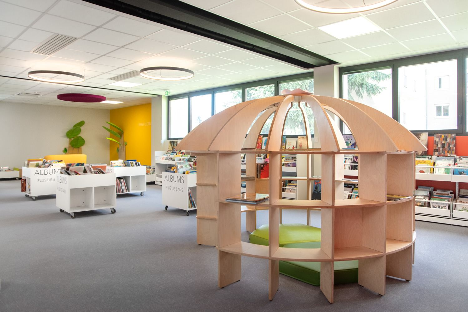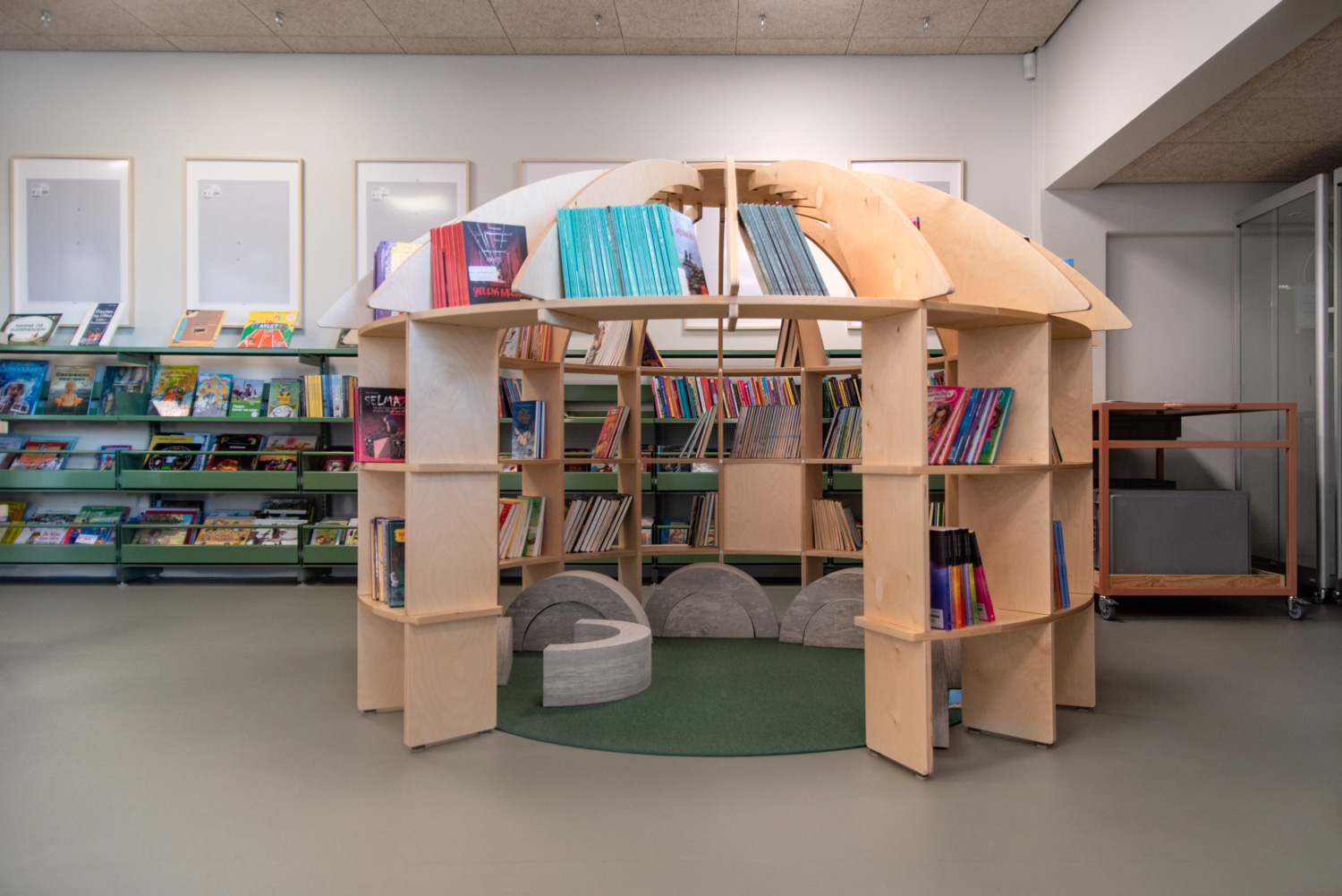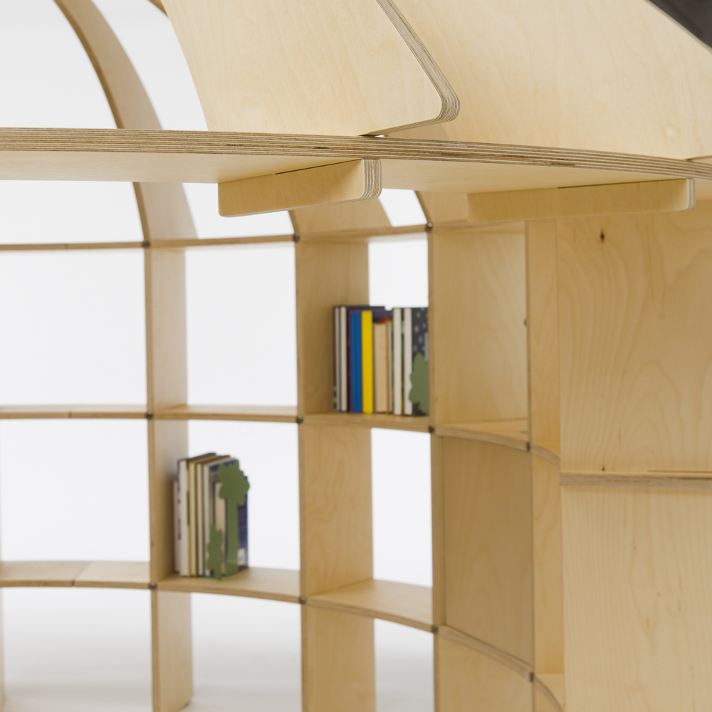 Die horizontalen Elementen verbinden die Konstruktion und bieten auf drei Ebenen reichlich Platz für Kinderbücher.