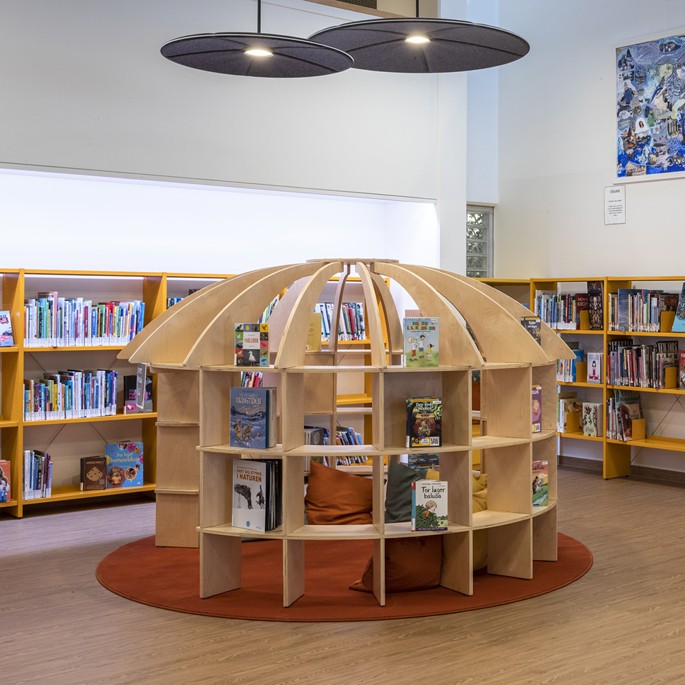 Multifunktionsraum und/oder großes, abgerundetes Bücherregal in Form einer einladenden afrikanischen Rundhütte.
