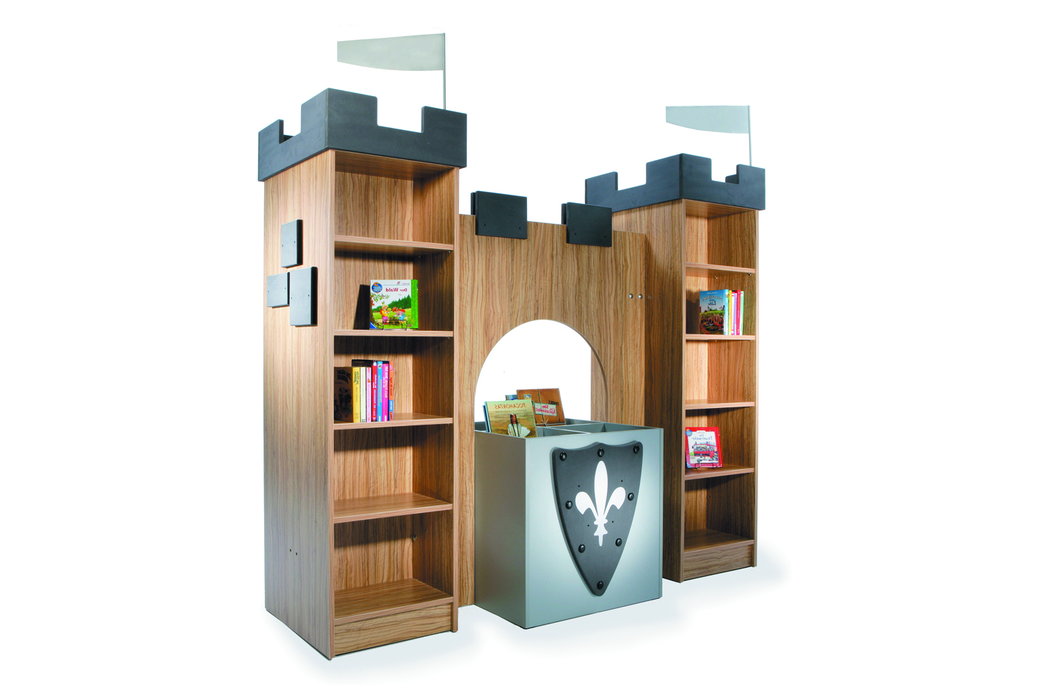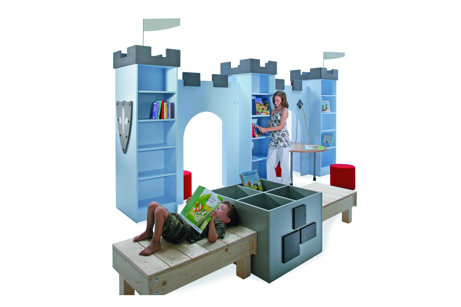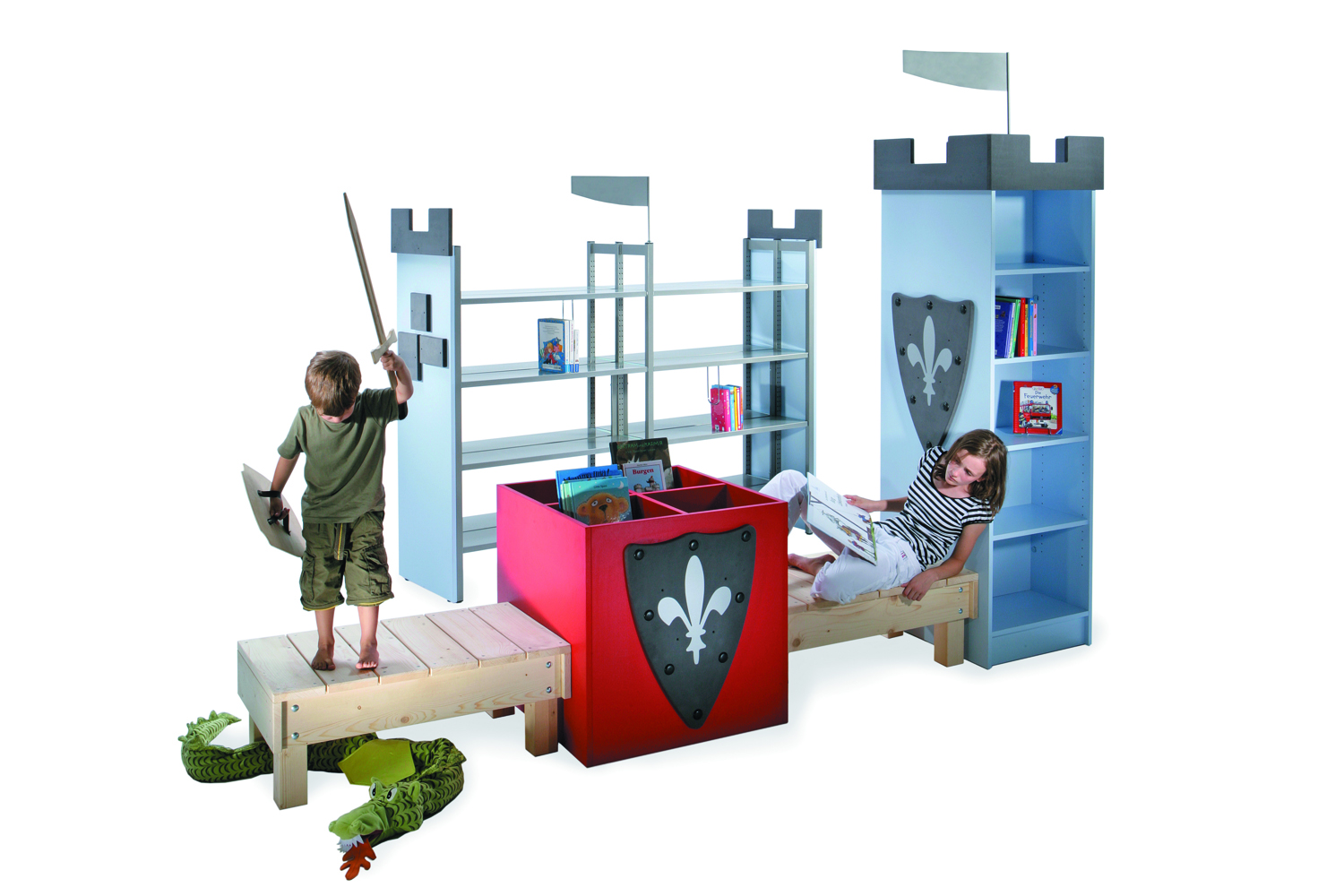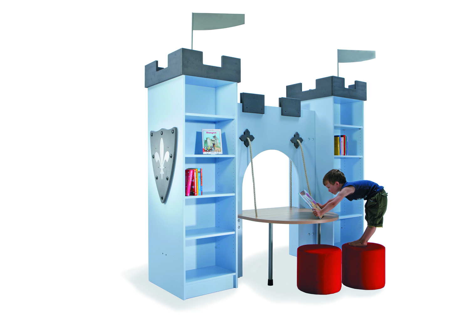 Eine stabile Zugbrücke in Tischform schafft auch für diese Themenwelt ritterliche, großzügige Anlese-, Spiel- und Arbeitsmöglichkeiten von beiden Seiten. Seitenverkleidungen mit themenbezogenen Motiven binden das Regal in dieses Gestaltungskonzept mit ein.