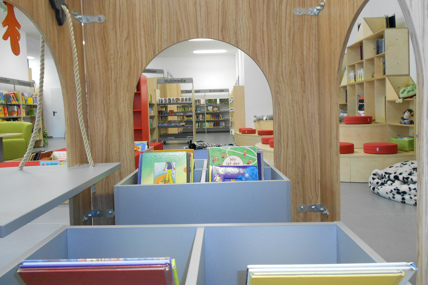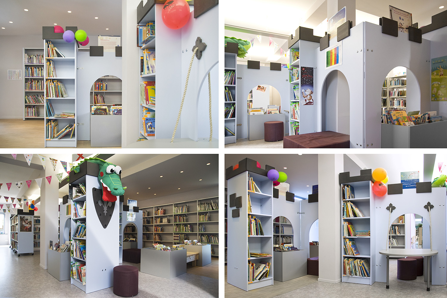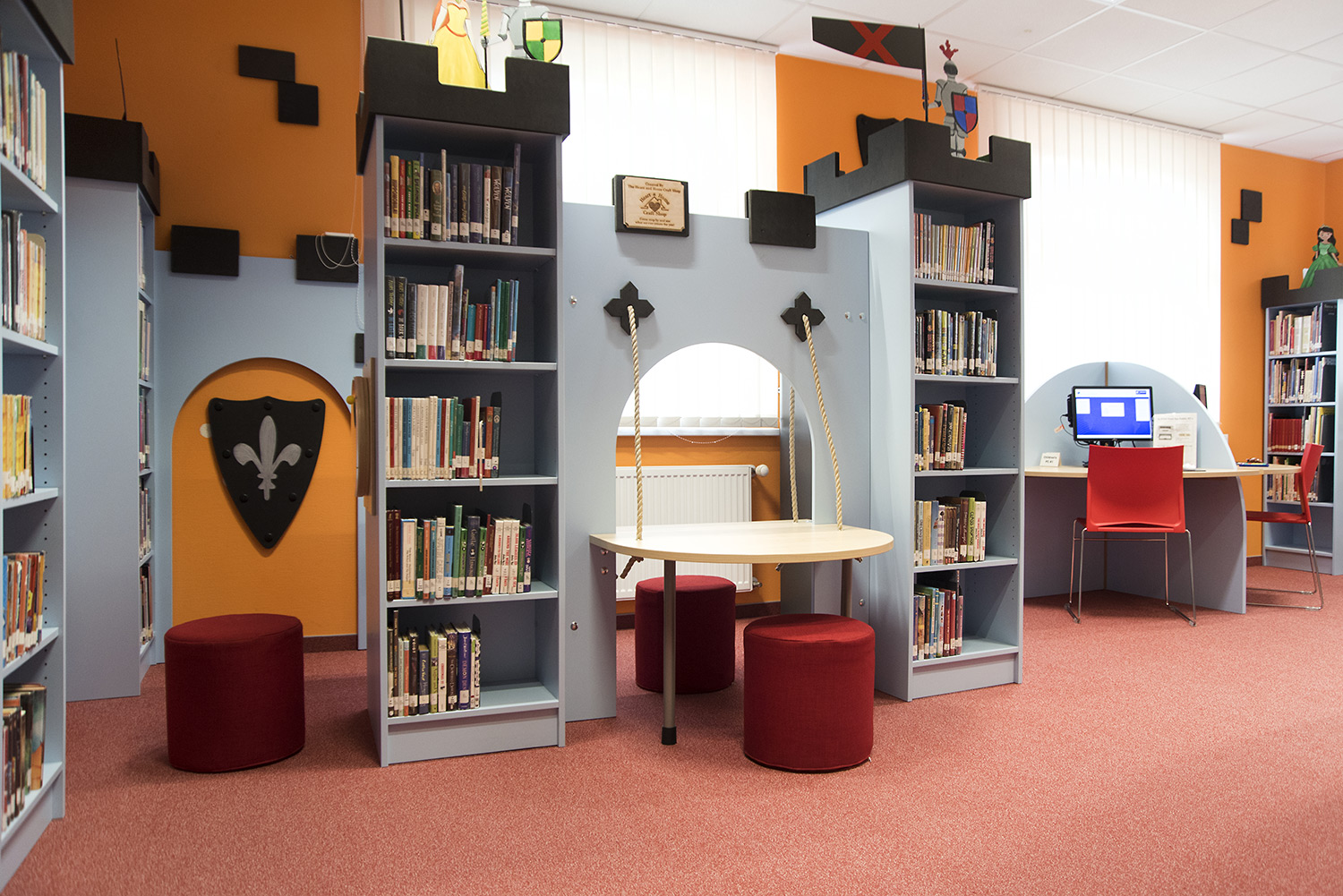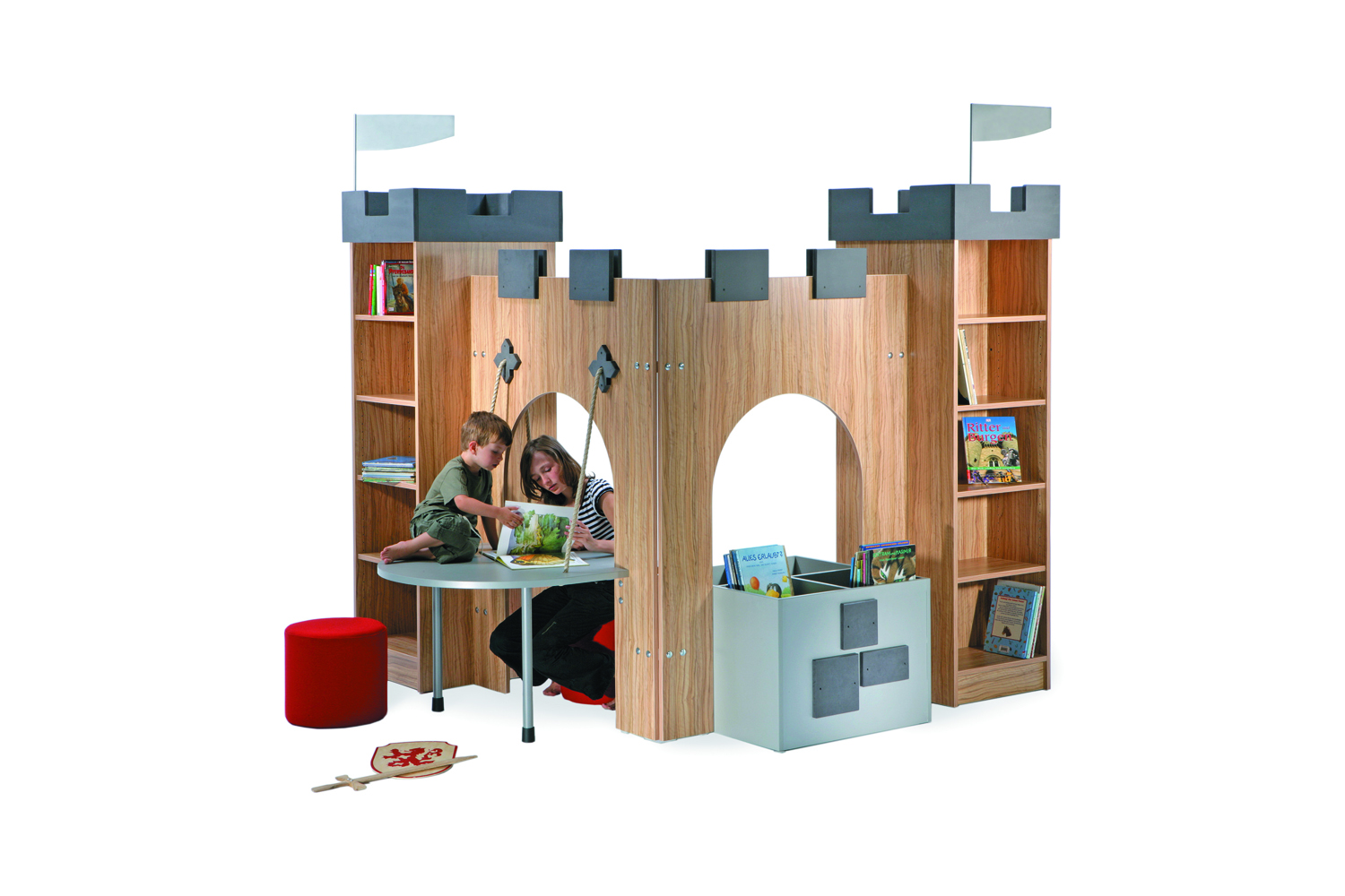 Eine stabile Zugbrücke in Tischform schafft auch für diese Themenwelt ritterliche, großzügige Anlese-, Spiel- und Arbeitsmöglichkeiten von beiden Seiten. Seitenverkleidungen mit themenbezogenen Motiven binden das Regal in dieses Gestaltungskonzept mit ein.