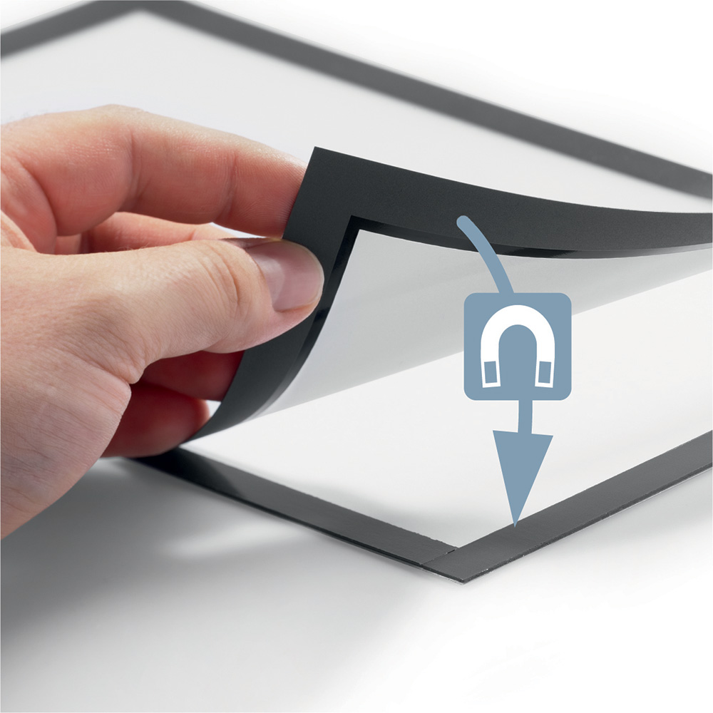 Der selbsthaftender magnetische Inforahmen (Duraframe®) kann einfach an eine glatte Tür, Wand, sowie Regalseiten usw angebracht werden.