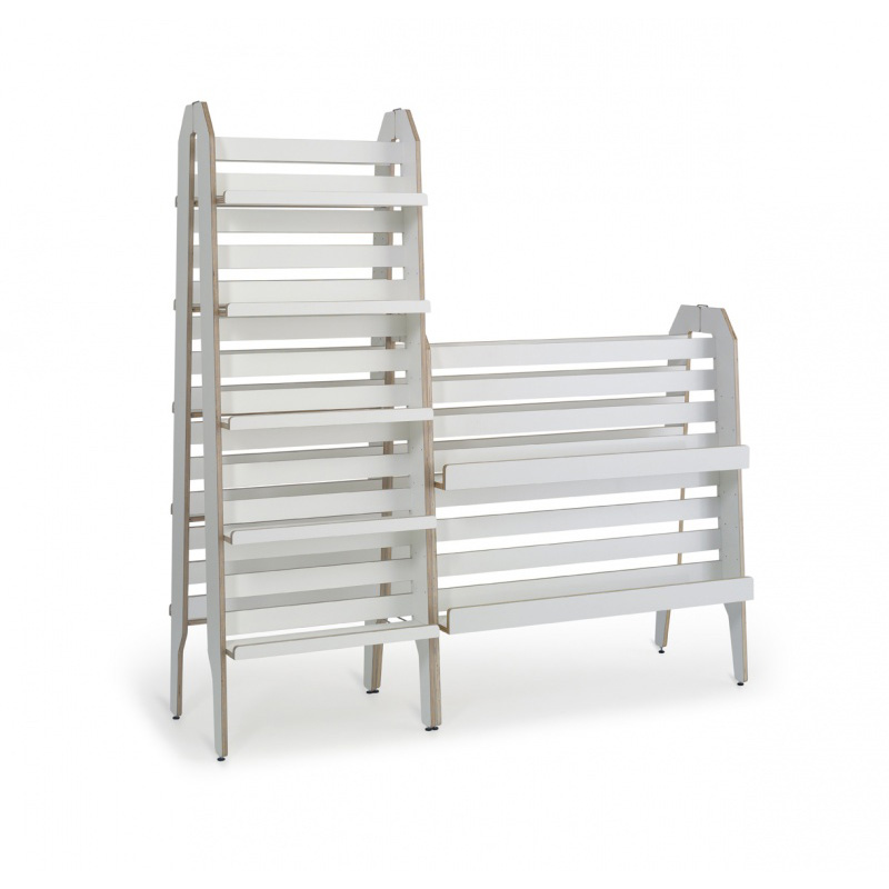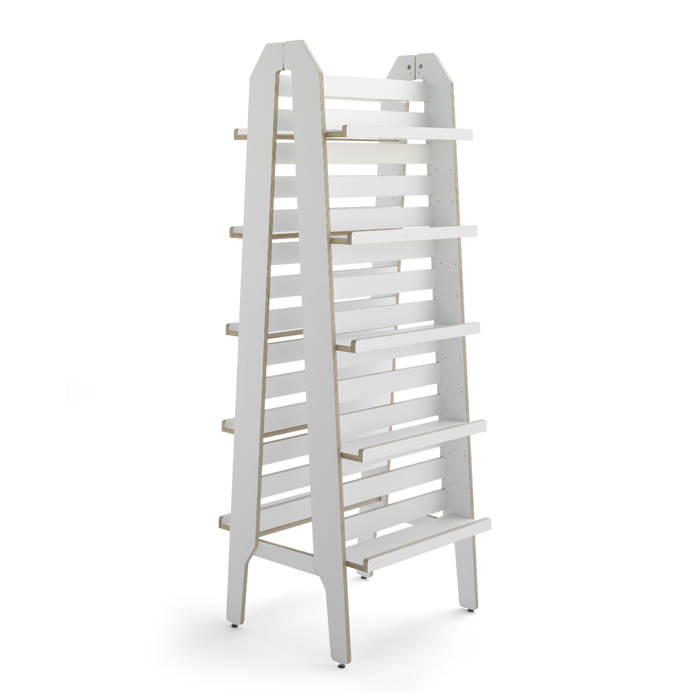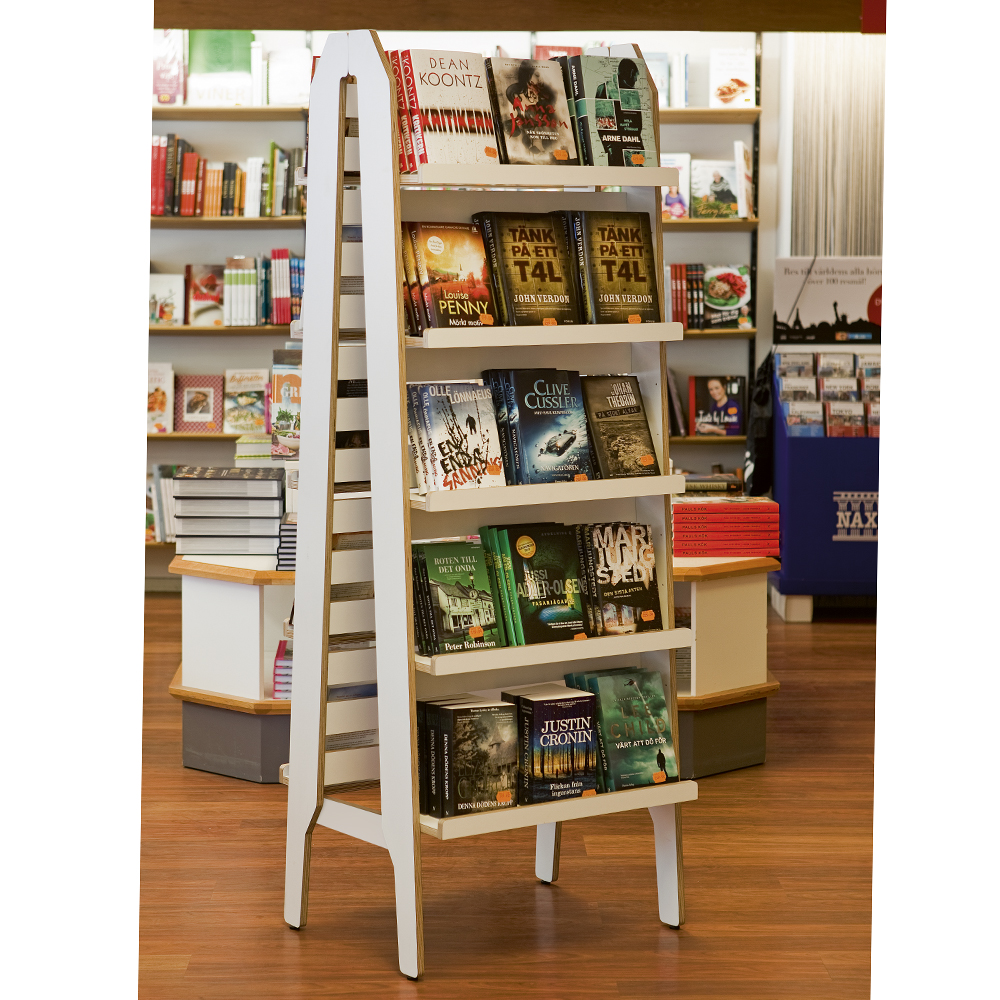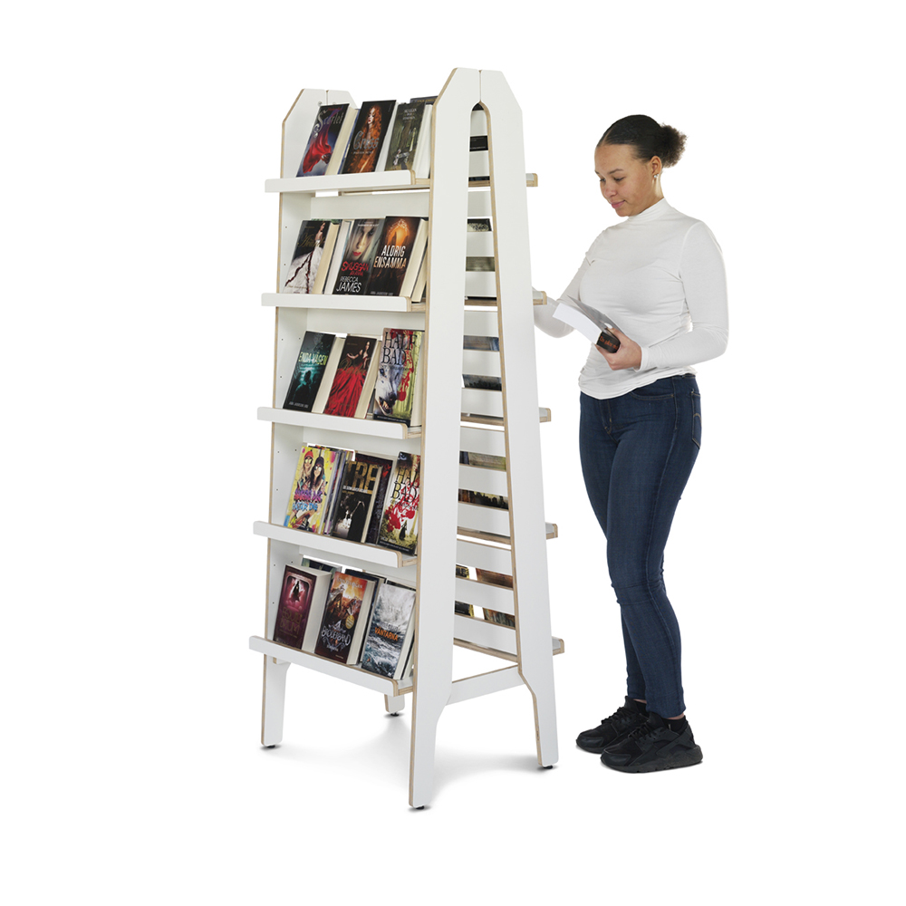 Vielseitiger, freistehender Ständer zur Präsentation der Buchvorderseiten oder zur Aufbewahrung von Taschenbüchern, Hörbüchern etc.