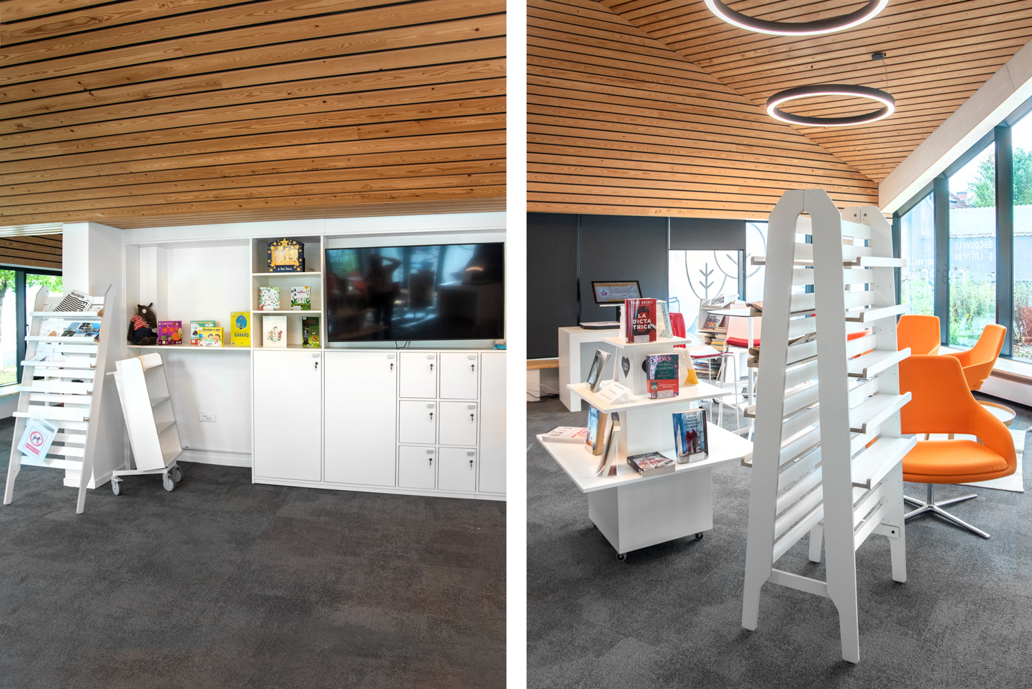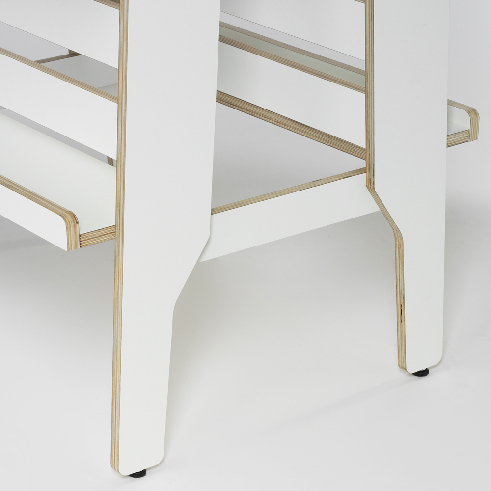 Hier geht es um laminiertes Birkensperrholz, auf dem Foto mit sichtbaren Kanten. Damit lassen sich eine strapazierfähige Oberfläche und eine langlebige Konstruktion erzielen. Ideal für die meisten stark beanspruchten Bibliotheksumgebungen!