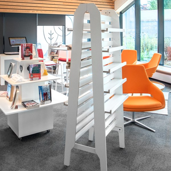 Vielseitiger, freistehender Ständer zur Präsentation der Buchvorderseiten oder zur Aufbewahrung von Taschenbüchern, Hörbüchern etc.