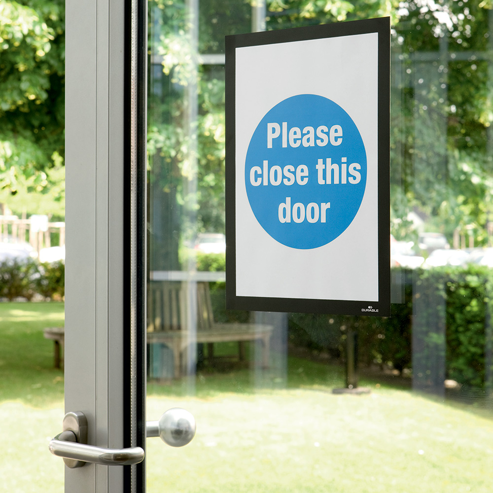 Die statische Magnetrahmen (Duraframe® Sun) lassen sich ohne Klebstoff befestigen (und ohne Blasenbildungsgefahr). Ideal für Werbung und Informationen zu größeren Fenstern und anderen Glasscheiben.