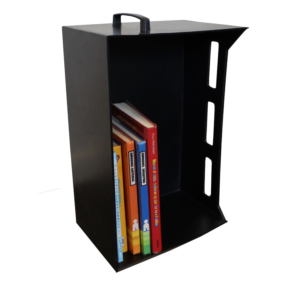Einfacher, leichter Korb mit Griff für Bücher und andere Medien.