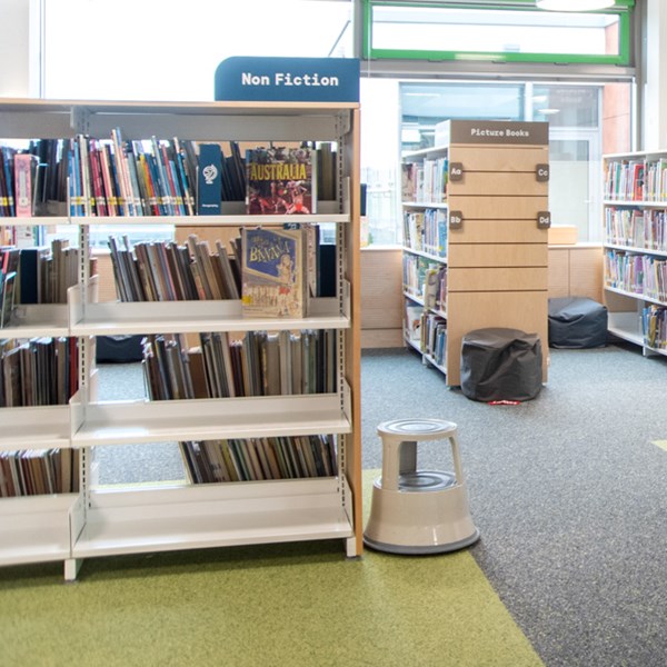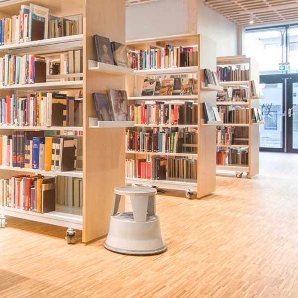 Tritthocker mit Rädern, die automatisch einfahren, wenn der Hocker belastet wird.