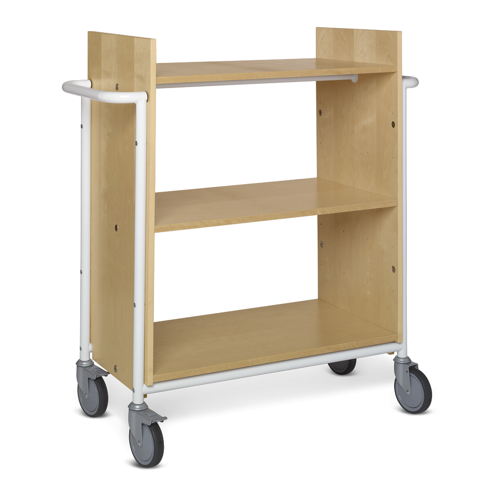 Geräumiger Bücherwagen/Transportwagen mit großzügigem Platz zwischen den Fachböden für Bücher und Ordner jeden Formats.