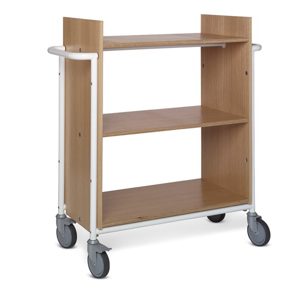 Geräumiger Bücherwagen/Transportwagen mit großzügigem Platz zwischen den Fachböden für Bücher und Ordner jeden Formats.