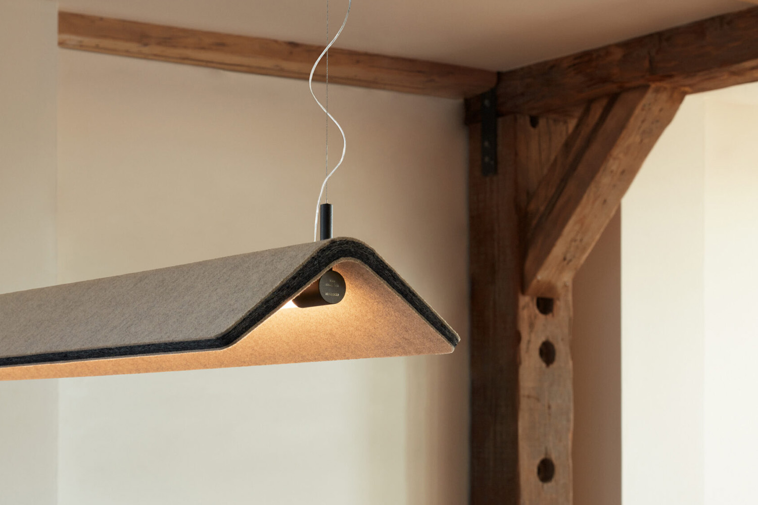 Die Lampe schafft eine angenehme Arbeitsumgebung, indem sie Geräusche reduziert und gleichzeitig die Beleuchtung in verschiedenen Bereichen der Bibliothek verbessert. Der weiche, schallabsorbierende Kern besteht aus teilweise recycelten PET-Flaschen.