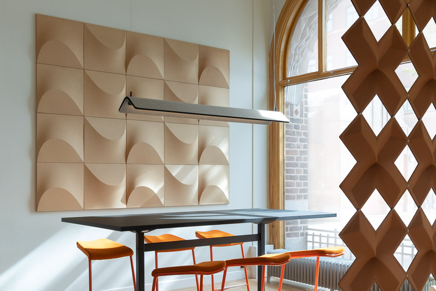 Vika Akustische Beleuchtung verbindet elegantes Lichtdesign mit schallabsorbierender Technologie. Ideal für Bibliotheken, die sowohl Wert auf Ästhetik als auch auf Funktionalität legen.