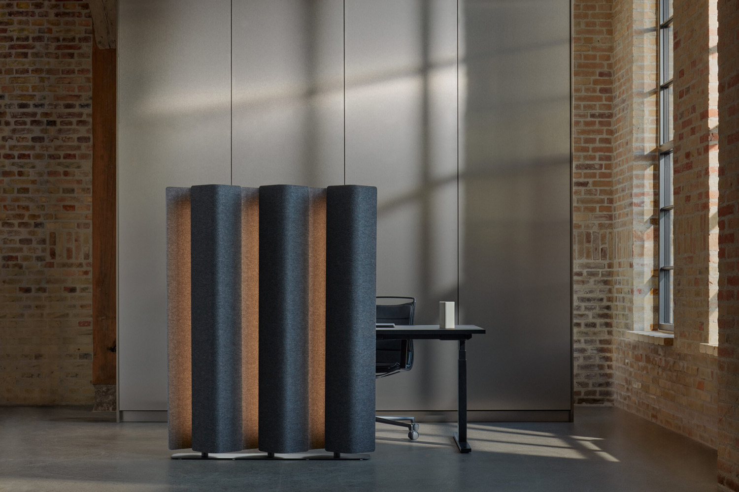 Die Trennwand, die sowohl auf Ästhetik als auch auf Funktionalität ausgerichtet ist, verbessert das Besuchererlebnis, indem sie einen komfortablen und produktiven Arbeitsbereich bietet. Die Trennwand Vika besteht aus einem schallabsorbierenden Kern, der teilweise aus recycelten PET-Flaschen hergestellt und mit Akustikfilz überzogen ist.