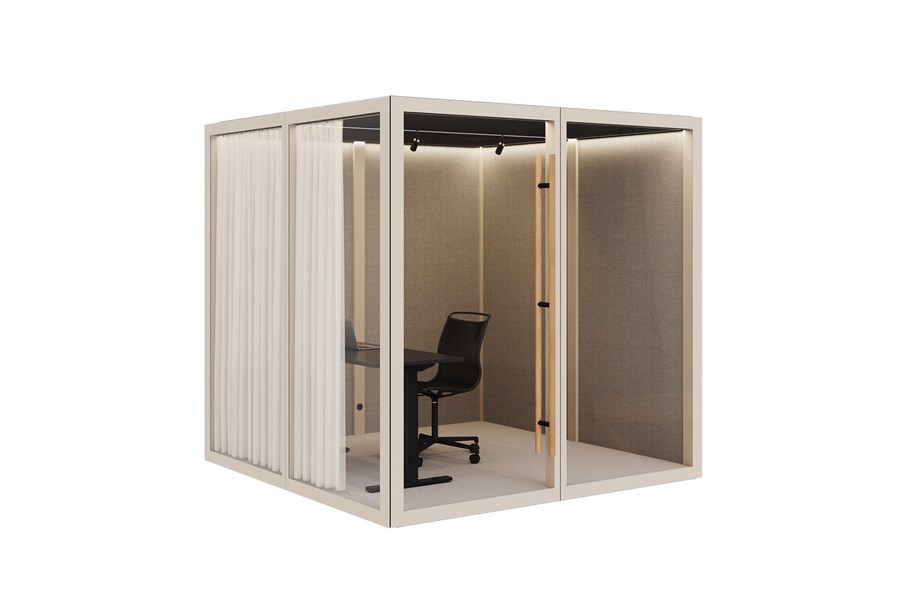 Zen Pod® kombiniert hochentwickelte schallabsorbierende Technologie mit elegantem Design. Zwei Wände sind mit Akustikglas ausgestattet, während die übrigen Wände schallabsorbierend sind und sowohl innen als auch außen mit Textilien verkleidet sind. Die Decke bietet ebenfalls Schalldämmung mit angenehmer Beleuchtung.